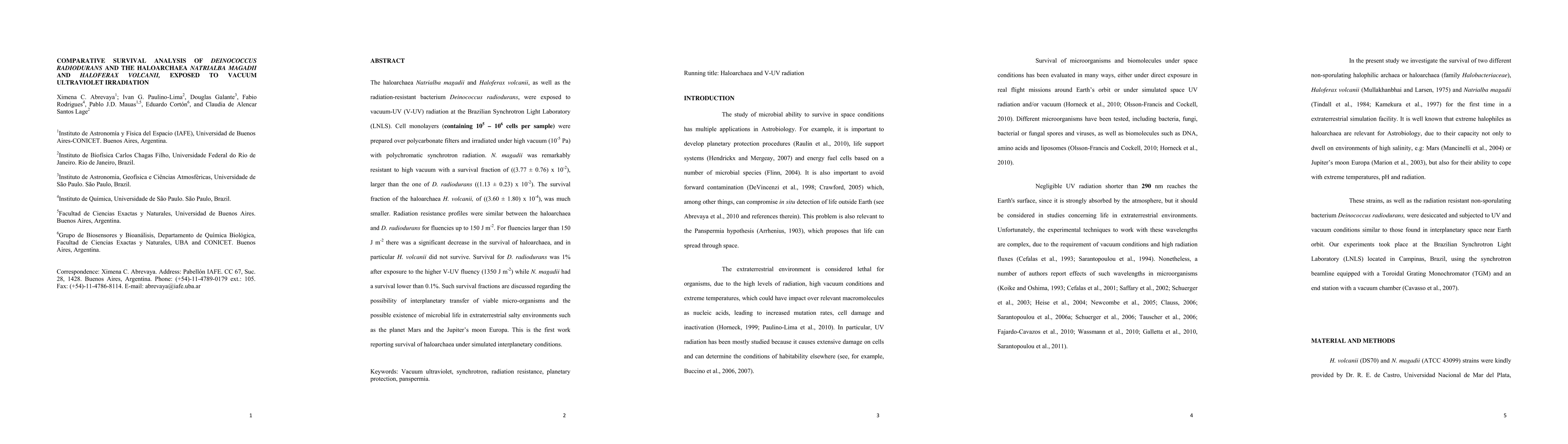 The haloarchaea Natrialba magadii and Haloferax volcanii, as well as the radiation-resistant bacterium Deinococcus radiodurans, were exposed to vacuum-UV (V-UV) radiation at the Brazilian Synchrotron Light Laboratory (LNLS). Cell monolayers (containing 105 - 106 cells per sample) were prepared over polycarbonate filters and irradiated under high vacuum (10-5 Pa) with polychromatic synchrotron radiation. N. magadii was remarkably resistant to high vacuum with a survival fraction of ((3.77 \pm 0.76) x 10-2), larger than the one of D. radiodurans ((1.13 \pm 0.23) x 10-2). The survival fraction of the haloarchaea H. volcanii, of ((3.60 \pm 1.80) x 10-4), was much smaller. Radiation resistance profiles were similar between the haloarchaea and D. radiodurans for fluencies up to 150 J m-2. For fluencies larger than 150 J m-2 there was a significant decrease in the survival of haloarchaea, and in particular H. volcanii did not survive. Survival for D. radiodurans was 1% after exposure to the higher V-UV fluency (1350 J m-2) while N. magadii had a survival lower than 0.1%. Such survival fractions are discussed regarding the possibility of interplanetary transfer of viable micro-organisms and the possible existence of microbial life in extraterrestrial salty environments such as the planet Mars and the Jupiter's moon Europa. This is the first work reporting survival of haloarchaea under simulated interplanetary conditions.