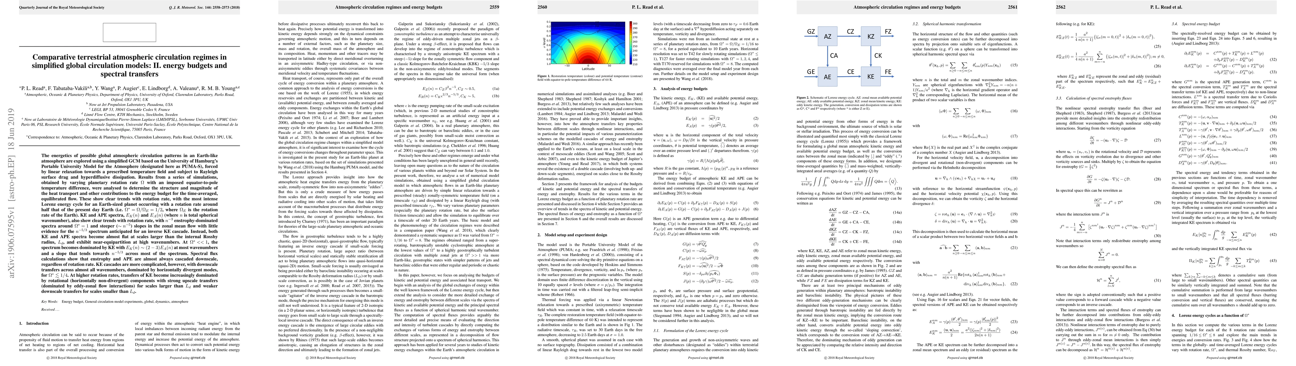 The energetics of possible global atmospheric circulation patterns in an Earth-like atmosphere are explored using a simplified GCM based on the University of Hamburg's Portable University Model for the Atmosphere. Results from a series of simulations, obtained by varying planetary rotation rate {\Omega} with an imposed equator-to-pole temperature difference, were analysed to determine the heat transport and other contributions to the energy budget for the time-averaged, equilibrated flow. These show clear trends with {\Omega}, with the most intense Lorenz energy cycle for an Earth-sized planet occurring with a rotation rate around half that of the present day Earth. KE and APE spectra, E_K(n) and E_A(n) (where n is total spherical wavenumber), also show clear trends with \Omega, with n^{-3} enstrophy-dominated spectra around \Omega* = \Omega/\Omega_E = 1, where \Omega_E is the rotation rate of the Earth) and steeper (\sim n^{-5}) slopes in the zonal mean flow with little evidence for the n^{-5/3} spectrum anticipated for an inverse KE cascade. Instead, both KE and APE spectra become almost flat at scales larger than the internal Rossby radius, L_d, and exhibit near-equipartition at high wavenumbers. At \Omega* << 1, the spectrum becomes dominated by KE with E_K(n) \sim 2-3 E_A(n) at most wavenumbers and a slope \sim n^{-5/3} across most of the spectrum. Spectral flux calculations show that enstrophy and APE are almost always cascaded downscale, regardless of {\Omega}. KE cascades are more complicated, however, with downscale transfers across almost all wavenumbers, dominated by horizontally divergent modes, for \Omega* \lesssim 1/4. At higher rotation rates, transfers of KE become increasingly dominated by rotational components with strong upscale transfers (dominated by eddy-zonal flow interactions) for scales larger than L_d and weaker downscale transfers for scales smaller than L_d.