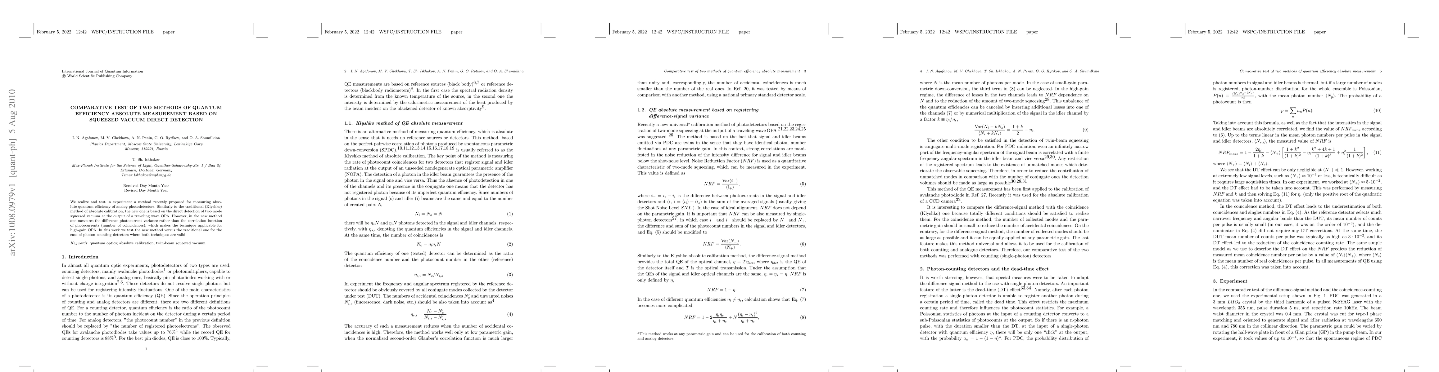 This paper compares two methods for measuring absolute quantum efficiency of analog photodetectors, focusing on a new technique based on squeezed vacuum direct detection that measures difference-photocurrent variance instead of coincidences, making it suitable for high-gain optical parametric amplifiers. Experimental results show the effectiveness of the new method against the traditional Klyshko method.