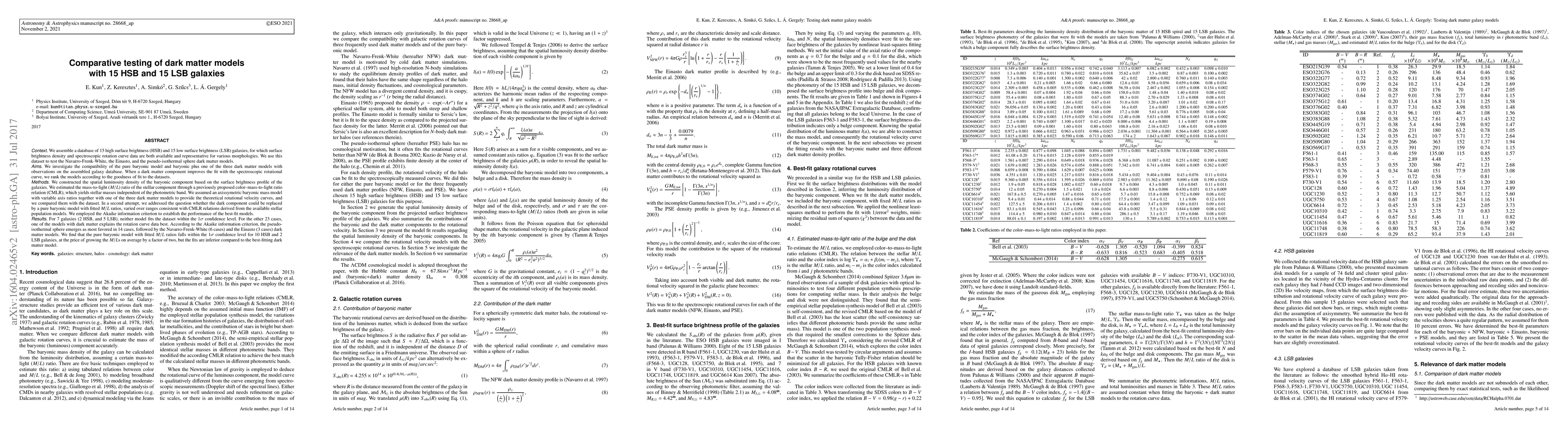 We assemble a database of 15 HSB and 15 LSB galaxies, for which surface brightness density and spectroscopic rotation curve data are both available and representative for various morphologies. We use this dataset to test the Navarro-Frenk-White, the Einasto, and the pseudo-isothermal sphere dark matter (DM) models. We investigate the compatibility of the pure baryonic model and baryonic plus one of the three DM models with observations on the assembled galaxy database. When a DM component improves the fit with the spectroscopic rotational curve, we rank the models according to the goodness of fit to the datasets. We constructed the spatial luminosity density of the baryonic component based on the surface brightness profile of the galaxies. We estimated the mass-to-light (M/L) ratio of the stellar component through a previously proposed color-mass-to-light ratio relation (CMLR). We assumed an axissymetric baryonic mass model with variable axis ratios together with one of the three DM models to provide the theoretical rotational velocity curves, and we compared them with the dataset. In a second attempt, we addressed the question whether the dark component could be replaced by a pure baryonic model with fitted M/L ratios. We employed the Akaike information criterion (AIC) to establish the performance of the best-fit models. For 7 galaxies, neither model fits the dataset within the 1{\sigma} confidence level. For the other 23 cases, one of the models with DM explains the rotation curve data best. According to the AIC, the PSE emerges as most favored in 14 cases, followed by the NFW (6 cases) and the Einasto (3 cases) DM models. We find that the pure baryonic model with fitted M/L ratios falls within the 1{\sigma} confidence level for 10 HSB and 2 LSB galaxies, at the price of growing the M/Ls on average by a factor of two, but the fits are inferior compared to the best-fitting DM model.