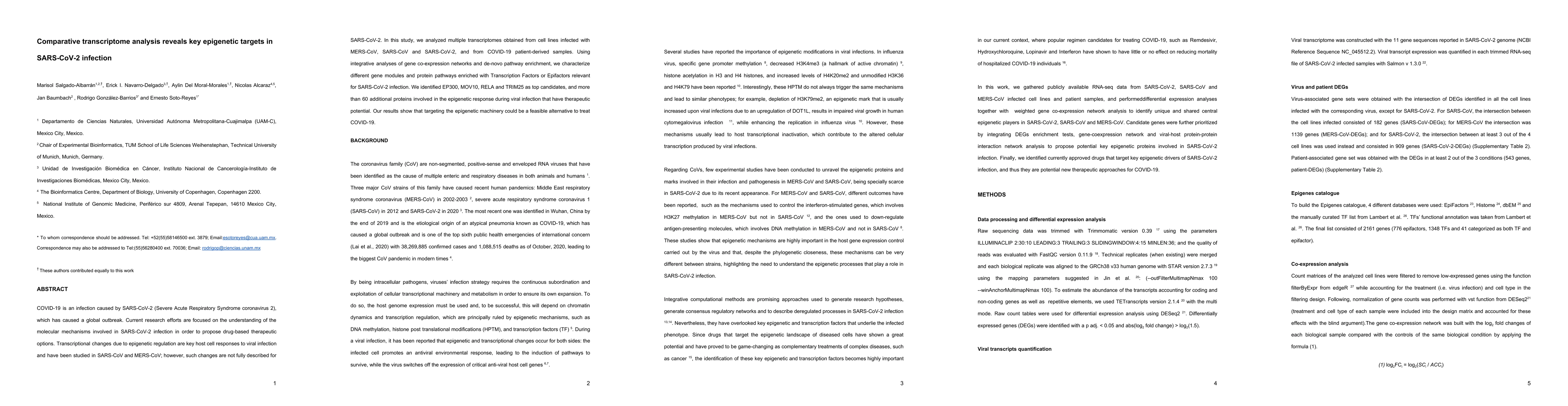 This study identifies key epigenetic targets, including EP300, MOV10, RELA, and TRIM25, involved in the host response to SARS-CoV-2 infection through comparative transcriptome analysis. Targeting the epigenetic machinery presents a potential therapeutic strategy for COVID-19.