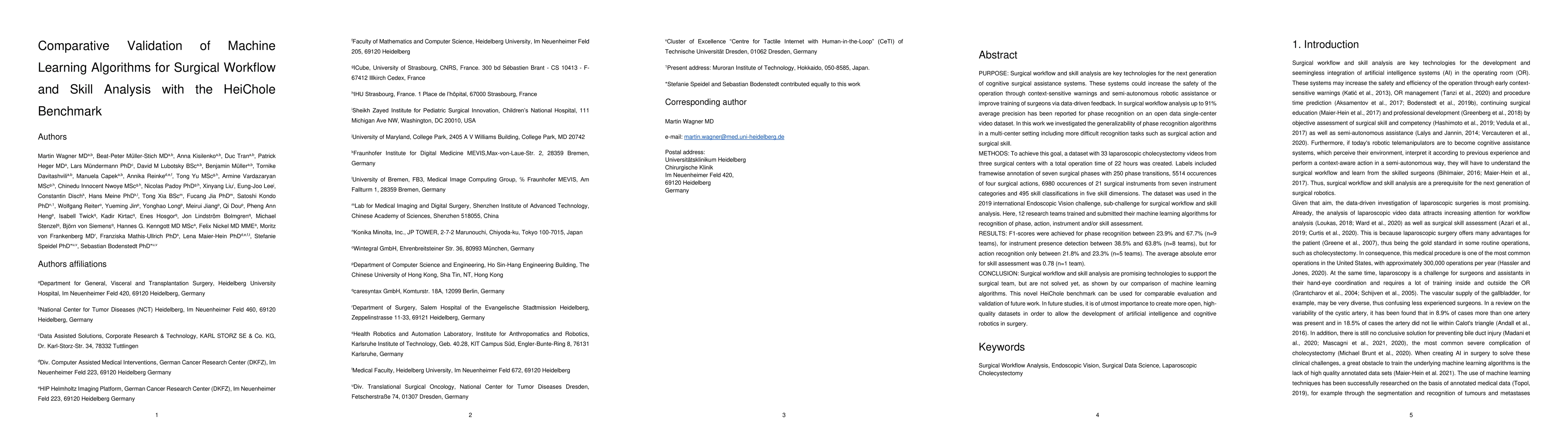 This study validates machine learning algorithms for surgical workflow and skill analysis using a multi-center HeiChole benchmark dataset. Results show varied performance, with phase recognition achieving the highest precision, while action recognition remains challenging, indicating the potential yet unmet promise of these technologies in surgical assistance.