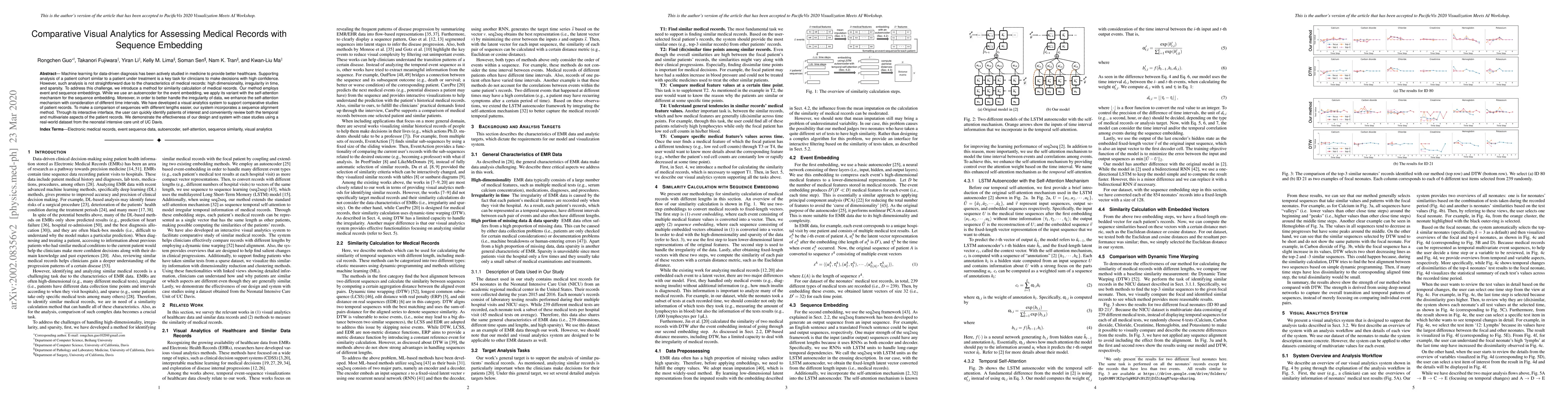 This research paper presents a visual analytics system for comparing medical records with sequence embeddings, enabling clinicians to make data-driven decisions with high confidence. The system uses event and sequence embeddings to handle irregularity in time and dimensionality, and incorporates a sequence alignment method for easier comparison of patients with different record lengths.