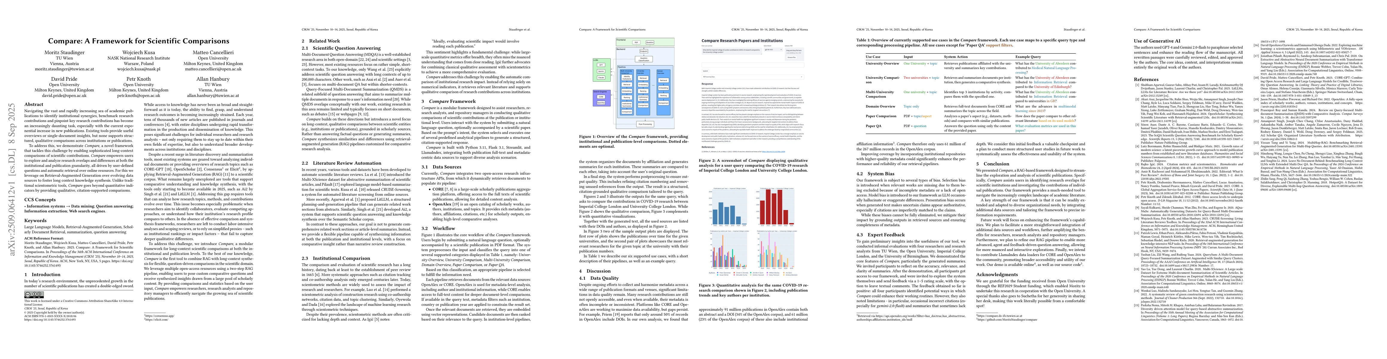 Navigating the vast and rapidly increasing sea of academic publications to identify institutional synergies, benchmark research contributions and pinpoint key research contributions has become an increasingly daunting task, especially with the current exponential increase in new publications. Existing tools provide useful overviews or single-document insights, but none supports structured, qualitative comparisons across institutions or publications. To address this, we demonstrate Compare, a novel framework that tackles this challenge by enabling sophisticated long-context comparisons of scientific contributions. Compare empowers users to explore and analyze research overlaps and differences at both the institutional and publication granularity, all driven by user-defined questions and automatic retrieval over online resources. For this we leverage on Retrieval-Augmented Generation over evolving data sources to foster long context knowledge synthesis. Unlike traditional scientometric tools, Compare goes beyond quantitative indicators by providing qualitative, citation-supported comparisons.