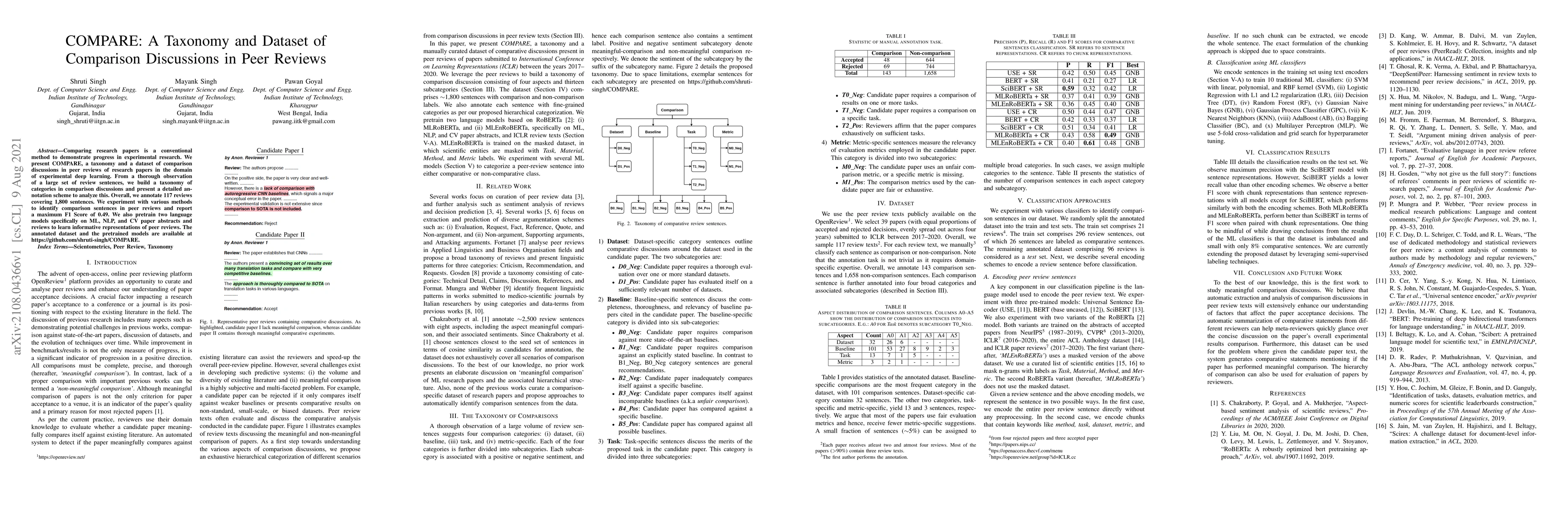 This paper introduces COMPARE, a taxonomy and dataset for analyzing comparison discussions in peer reviews of experimental deep learning papers. The authors annotate 117 reviews and develop a detailed scheme to identify comparison sentences, achieving a maximum F1 score of 0.49. They also pretrain language models on ML, NLP, and CV paper abstracts and reviews.