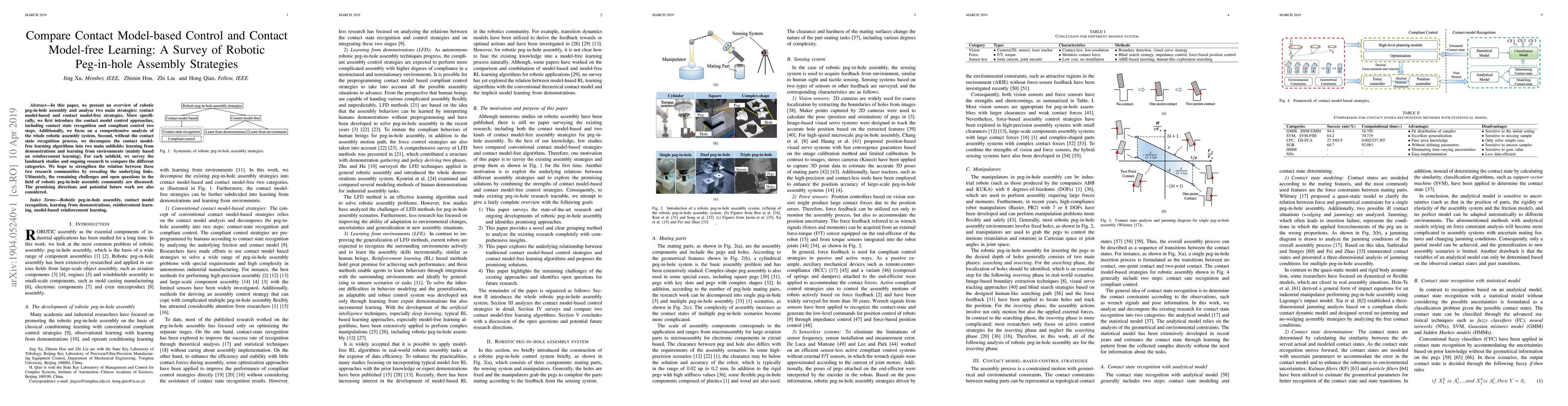 This paper surveys robotic peg-in-hole assembly strategies, comparing contact model-based control approaches with contact model-free learning methods, including learning from demonstrations and reinforcement learning. It aims to bridge research communities and highlights future research directions.