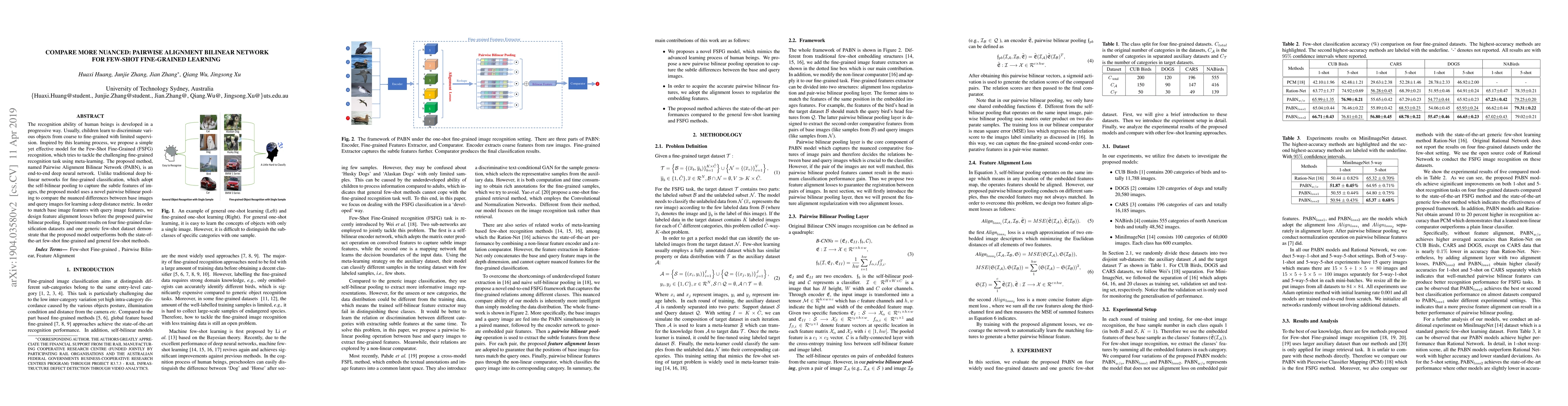 The paper proposes a Pairwise Alignment Bilinear Network (PABN) for few-shot fine-grained recognition, utilizing a novel pairwise bilinear pooling and feature alignment losses to capture nuanced image differences. The method outperforms state-of-the-art few-shot recognition models on multiple datasets.