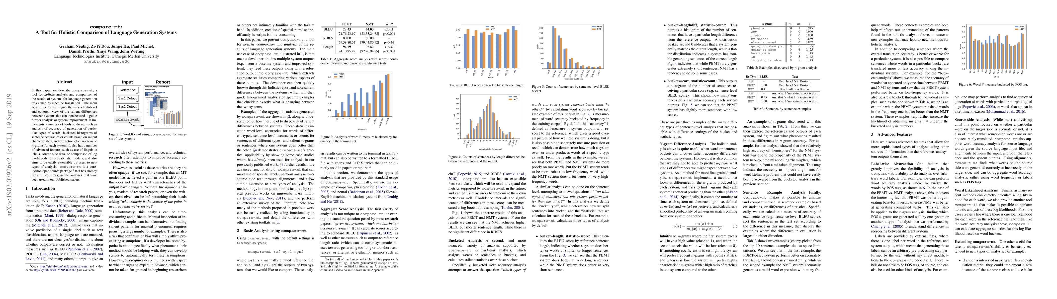 In this paper, we describe compare-mt, a tool for holistic analysis and comparison of the results of systems for language generation tasks such as machine translation. The main goal of the tool is to give the user a high-level and coherent view of the salient differences between systems that can then be used to guide further analysis or system improvement. It implements a number of tools to do so, such as analysis of accuracy of generation of particular types of words, bucketed histograms of sentence accuracies or counts based on salient characteristics, and extraction of characteristic $n$-grams for each system. It also has a number of advanced features such as use of linguistic labels, source side data, or comparison of log likelihoods for probabilistic models, and also aims to be easily extensible by users to new types of analysis. The code is available at https://github.com/neulab/compare-mt