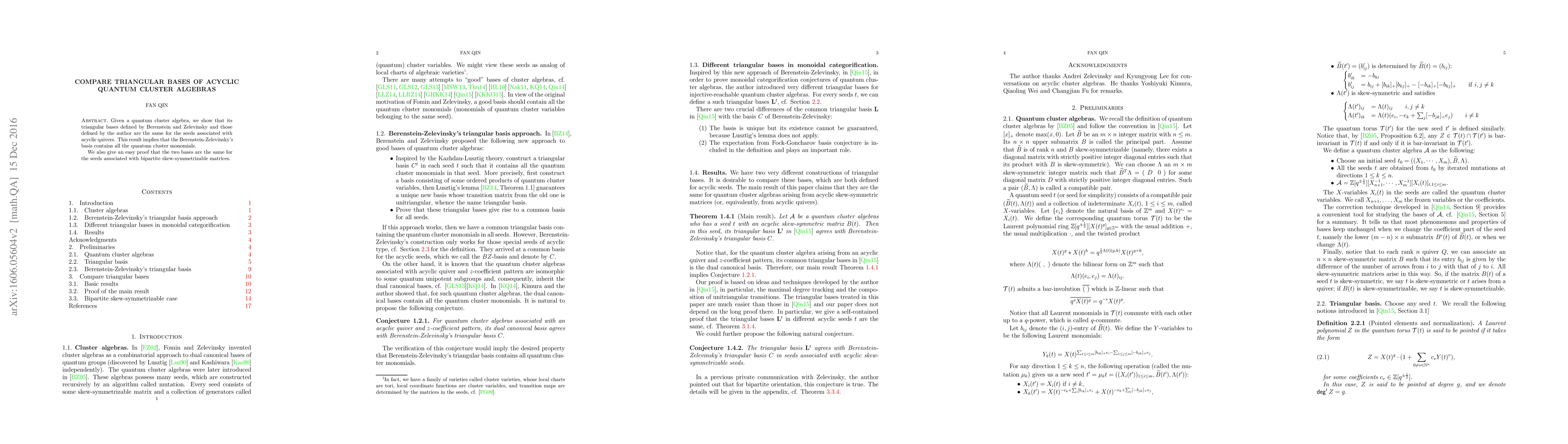 This paper demonstrates that two distinct triangular bases in acyclic quantum cluster algebras, defined by Berenstein-Zelevinsky and the author, are equivalent. This equivalence implies the comprehensiveness of the Berenstein-Zelevinsky basis in representing quantum cluster monomials. Additionally, it provides a straightforward proof for the same result in seeds associated with bipartite skew-symmetrizable matrices.