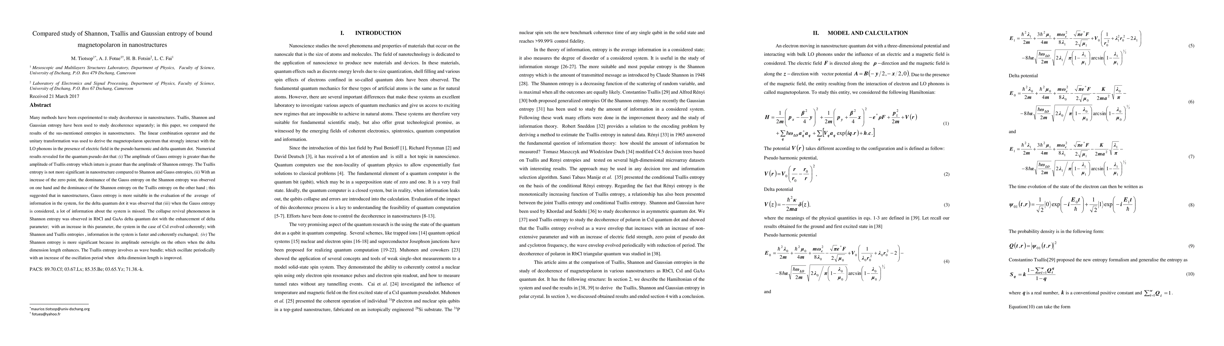 Many methods have been experimented to study decoherence in nanostructures. Tsallis, Shannon and Gaussian entropy have been used to study decoherence separately; in this paper, we compared the results of the sus-mentioned entropies in nanostructures. The linear combination operator and the unitary transformation was used to derive the magnetopolaron spectrum that strongly interact with the LO phonons in the presence of electric field in the pseudo harmonic and delta quantum dot. Numerical results revealed for the quantum pseudo dot that: (i) The amplitude of Gauss entropy is greater than the amplitude of Tsallis entropy which inturn is greater than the amplitude of Shannon entropy. The Tsallis entropy is not more significant in nanostructure compared to Shannon and Gauss entropies, (ii) With an increase of the zero point, the dominance of the Gauss entropy on the Shannon entropy was observed on one hand and the dominance of the Shannon entropy on the Tsallis entropy on the other hand ; this suggested that in nanostructures, Gauss entropy is more suitable in the evaluation of the average of information in the system, for the delta quantum dot it was observed that (iii) when the Gauss entropy is considered, a lot of information about the system is missed. The collapse revival phenomenon in Shannon entropy was observed in RbCl and GaAs delta quantum dot with the enhancement of delta parameter; with an increase in this parameter, the system in the case of CsI evolved coherently; with Shannon and Tsallis entropies , information in the system is faster and coherently exchanged; (iv) The Shannon entropy is more significant because its amplitude outweighs on the others when the delta dimension length enhances. The Tsallis entropy involves as wave bundle; which oscillate periodically with an increase of the oscillation period when delta dimension length is improved.