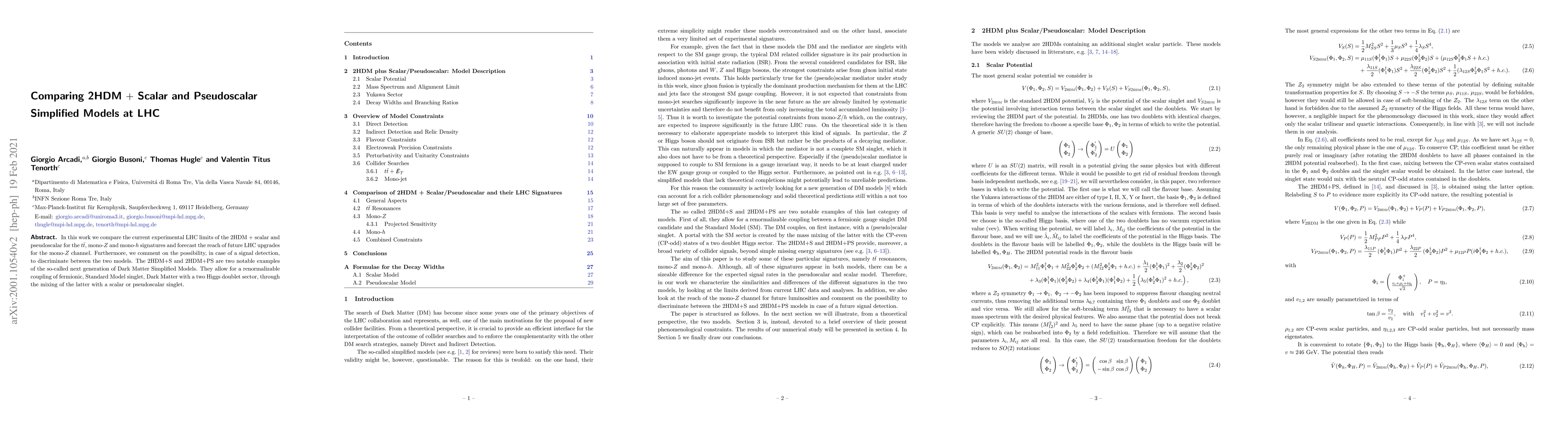 In this work we compare the current experimental LHC limits of the 2HDM $+$ scalar and pseudoscalar for the $t \bar{t}$, mono-$Z$ and mono-$h$ signatures and forecast the reach of future LHC upgrades for the mono-$Z$ channel. Furthermore, we comment on the possibility, in case of a signal detection, to discriminate between the two models. The 2HDM+S and 2HDM+PS are two notable examples of the so-called next generation of Dark Matter Simplified Models. They allow for a renormalizable coupling of fermionic, Standard Model singlet, Dark Matter with a two Higgs doublet sector, through the mixing of the latter with a scalar or pseudoscalar singlet.