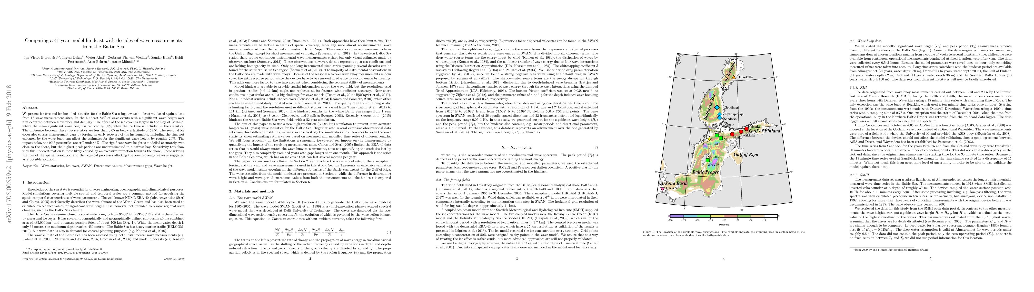 A 41-year wave model was validated against Baltic Sea data, showing that seasonal ice cover reduces significant wave height in certain areas, but may underestimate peak periods due to refraction effects.