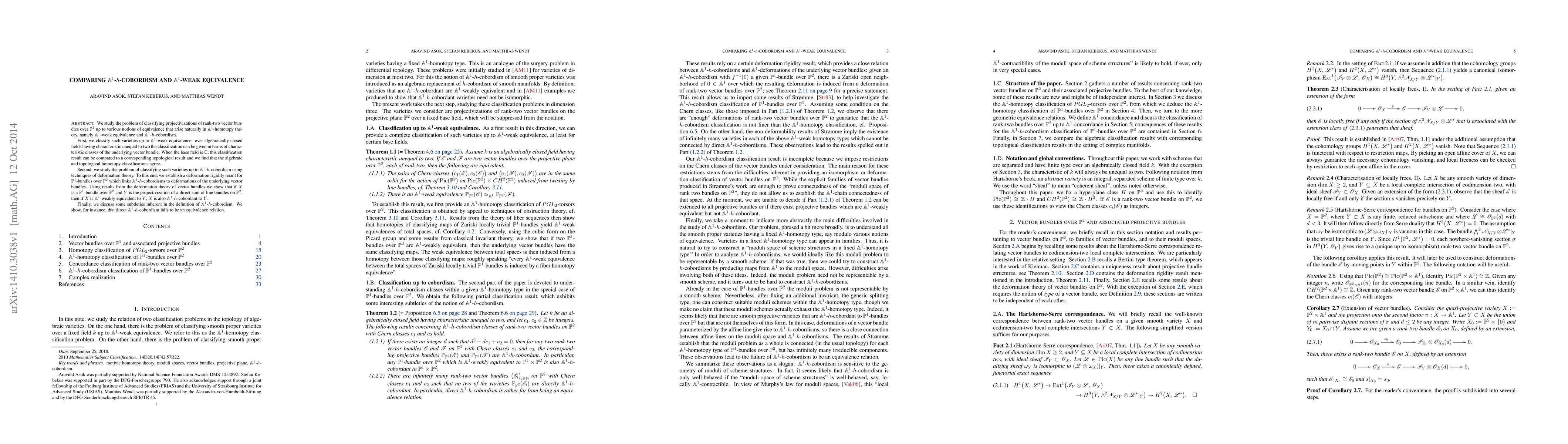 This paper classifies projectivizations of rank-two vector bundles over ${\mathbb P}^2$ up to ${\mathbb A}^1$-weak equivalence and ${\mathbb A}^1$-$h$-cobordism. It demonstrates that the classifications agree for algebraically closed fields and ${\mathbb C}$, while also revealing deformation theory connections and subtleties in the ${\mathbb A}^1$-$h$-cobordism definition.