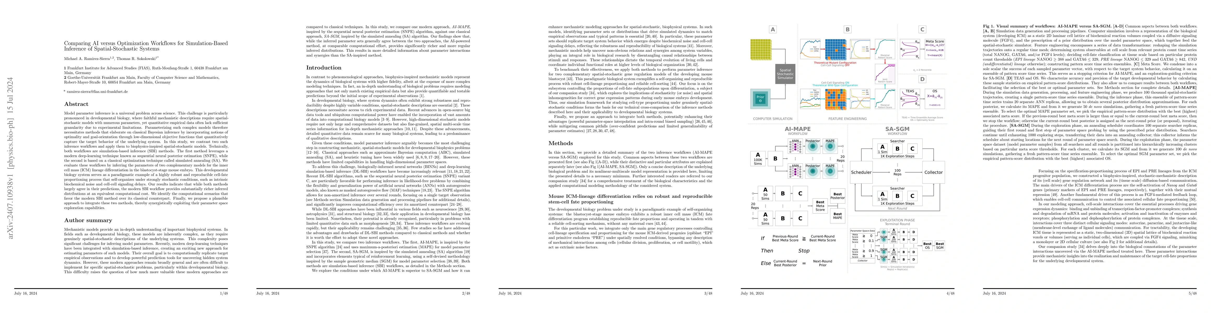Model parameter inference is a universal problem across science. This challenge is particularly pronounced in developmental biology, where faithful mechanistic descriptions require spatial-stochastic models with numerous parameters, yet quantitative empirical data often lack sufficient granularity due to experimental limitations. Parameterizing such complex models thus necessitates methods that elaborate on classical Bayesian inference by incorporating notions of optimality and goal-orientation through low-dimensional objective functions that quantitatively capture the target behavior of the underlying system. In this study, we contrast two such inference workflows and apply them to biophysics-inspired spatial-stochastic models. Technically, both workflows are simulation-based inference (SBI) methods. The first method leverages a modern deep-learning technique known as sequential neural posterior estimation (SNPE), while the second is based on a classical optimization technique called simulated annealing (SA). We evaluate these workflows by inferring the parameters of two complementary models for the inner cell mass (ICM) lineage differentiation in the blastocyst-stage mouse embryo. This developmental biology system serves as a paradigmatic example of a highly robust and reproducible cell-fate proportioning process that self-organizes under strongly stochastic conditions, such as intrinsic biochemical noise and cell-cell signaling delays. Our results indicate that while both methods largely agree in their predictions, the modern SBI workflow provides substantially richer inferred distributions at an equivalent computational cost. We identify the computational scenarios that favor the modern SBI method over its classical counterpart. Finally, we propose a plausible approach to integrate these two methods, thereby synergistically exploiting their parameter space exploration capabilities.