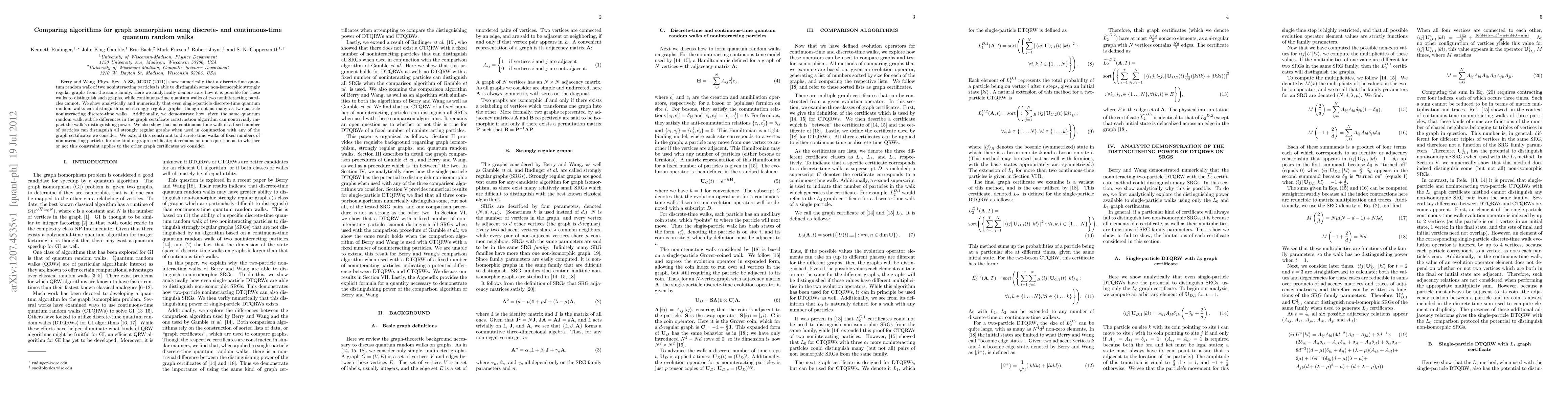 Berry and Wang [Phys. Rev. A {\bf 83}, 042317 (2011)] show numerically that a discrete-time quantum random walk of two noninteracting particles is able to distinguish some non-isomorphic strongly regular graphs from the same family. Here we analytically demonstrate how it is possible for these walks to distinguish such graphs, while continuous-time quantum walks of two noninteracting particles cannot. We show analytically and numerically that even single-particle discrete-time quantum random walks can distinguish some strongly regular graphs, though not as many as two-particle noninteracting discrete-time walks. Additionally, we demonstrate how, given the same quantum random walk, subtle differences in the graph certificate construction algorithm can nontrivially impact the walk's distinguishing power. We also show that no continuous-time walk of a fixed number of particles can distinguish all strongly regular graphs when used in conjunction with any of the graph certificates we consider. We extend this constraint to discrete-time walks of fixed numbers of noninteracting particles for one kind of graph certificate; it remains an open question as to whether or not this constraint applies to the other graph certificates we consider.