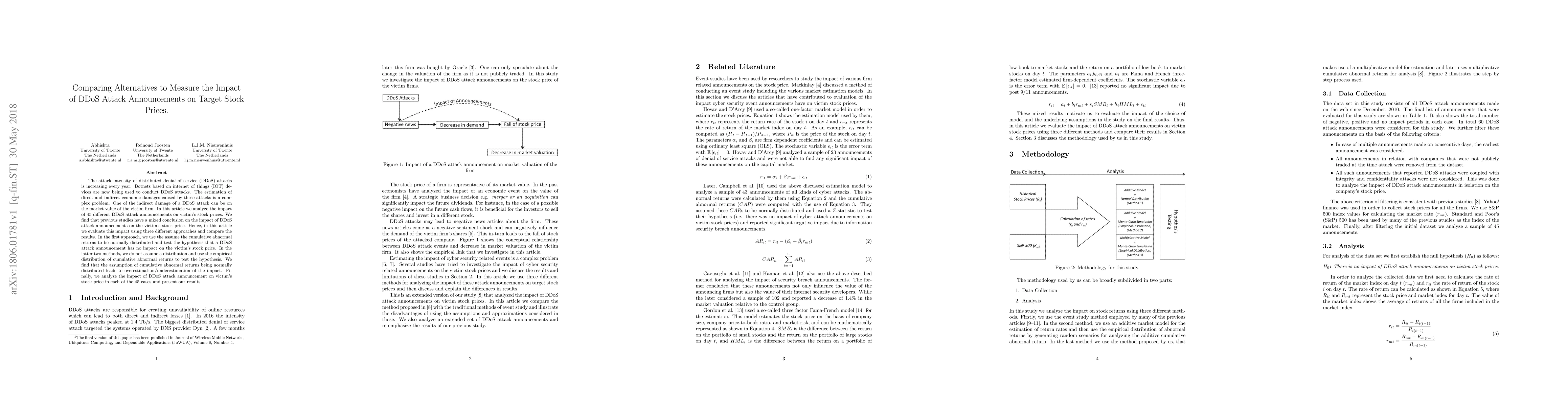 This paper investigates the impact of DDoS attack announcements on target firm stock prices using three different analytical approaches. It finds that assuming normal distribution of cumulative abnormal returns leads to inaccurate estimations, while empirical distribution methods provide more accurate results.