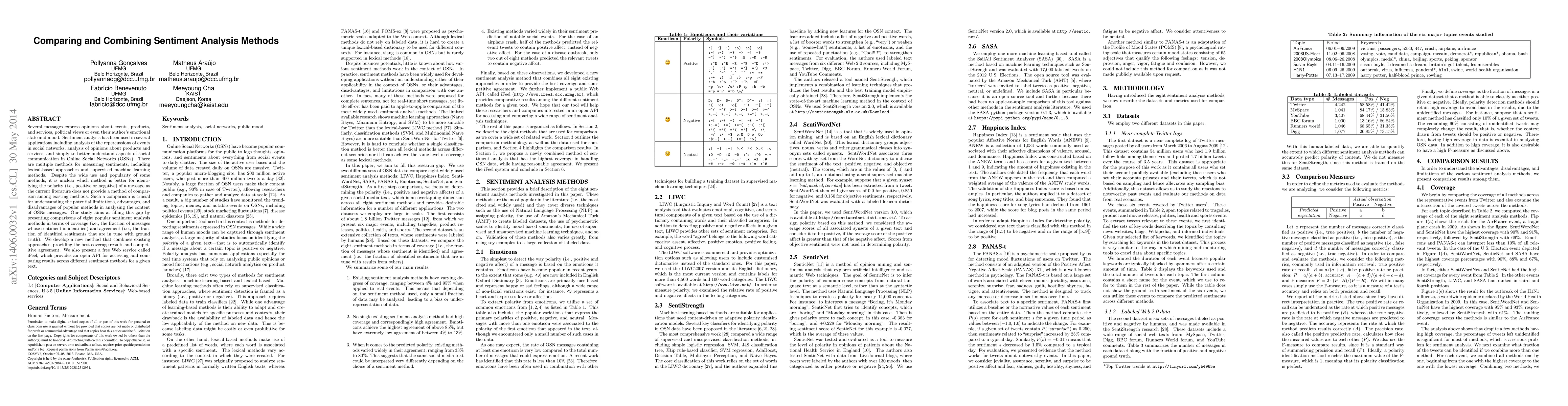 Several messages express opinions about events, products, and services, political views or even their author's emotional state and mood. Sentiment analysis has been used in several applications including analysis of the repercussions of events in social networks, analysis of opinions about products and services, and simply to better understand aspects of social communication in Online Social Networks (OSNs). There are multiple methods for measuring sentiments, including lexical-based approaches and supervised machine learning methods. Despite the wide use and popularity of some methods, it is unclear which method is better for identifying the polarity (i.e., positive or negative) of a message as the current literature does not provide a method of comparison among existing methods. Such a comparison is crucial for understanding the potential limitations, advantages, and disadvantages of popular methods in analyzing the content of OSNs messages. Our study aims at filling this gap by presenting comparisons of eight popular sentiment analysis methods in terms of coverage (i.e., the fraction of messages whose sentiment is identified) and agreement (i.e., the fraction of identified sentiments that are in tune with ground truth). We develop a new method that combines existing approaches, providing the best coverage results and competitive agreement. We also present a free Web service called iFeel, which provides an open API for accessing and comparing results across different sentiment methods for a given text.