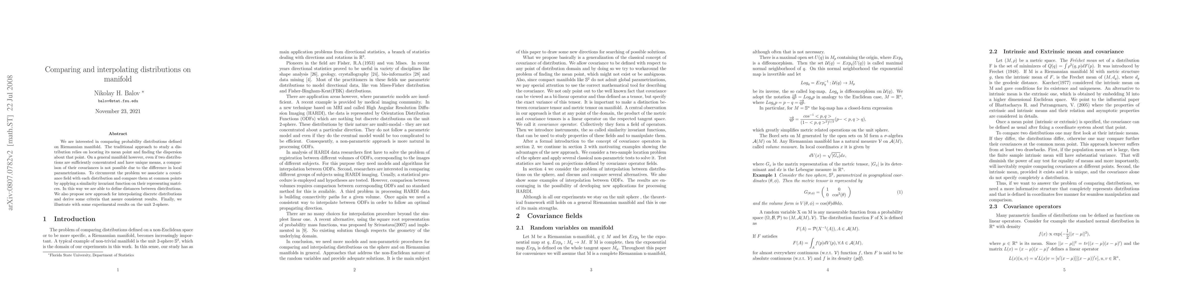 Researchers develop a method to compare and interpolate probability distributions on Riemannian manifolds by associating covariance fields with each distribution and applying similarity-invariant functions to their representing matrices.
