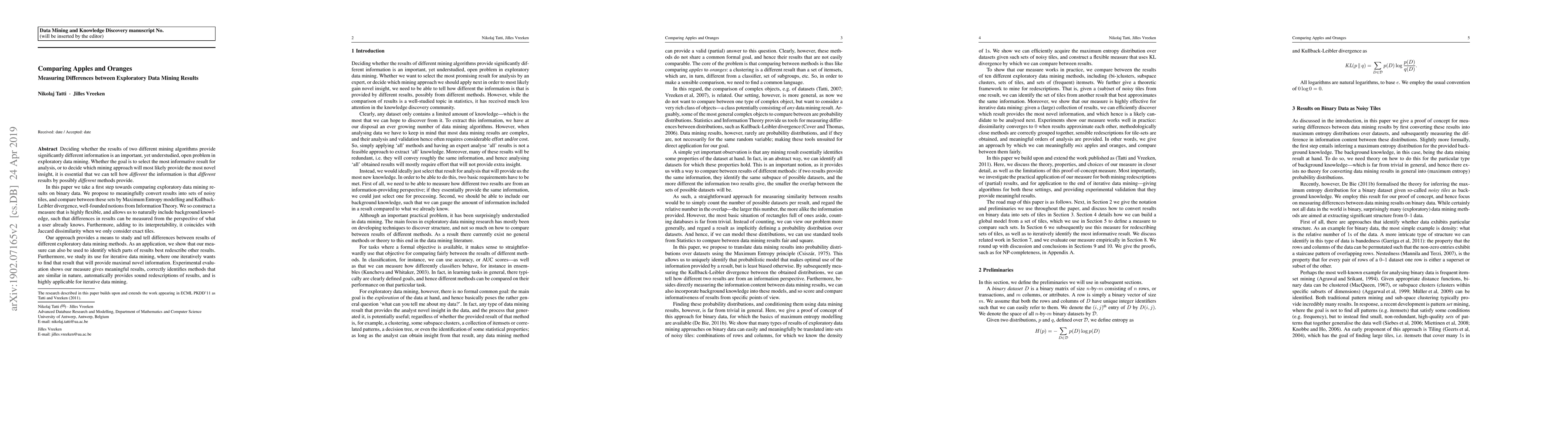 This paper proposes a method to compare results from different exploratory data mining algorithms on binary data, using Maximum Entropy modelling and Kullback-Leibler divergence, to measure differences in information and identify novel insights.