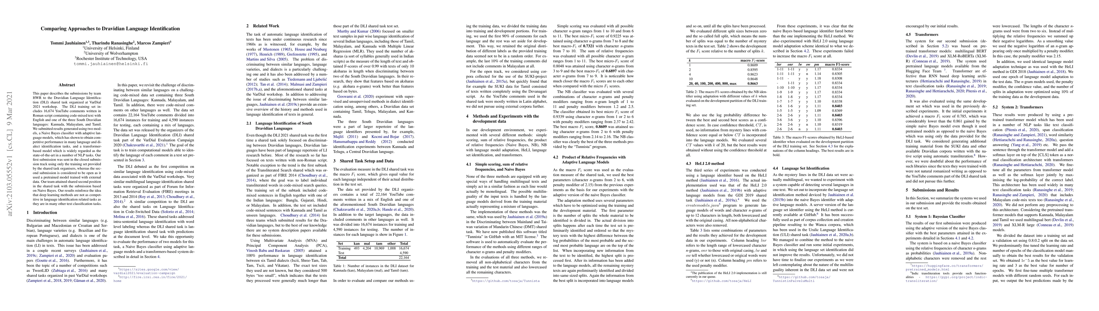 The paper details team HWR's participation in the Dravidian Language Identification shared task at VarDial 2021. They compared a Naive Bayes classifier with adaptive language models to a transformer-based model for identifying Kannada, Malayalam, and Tamil in code-mixed text. The Naive Bayes model achieved a shared second position, suggesting deep learning methods may not be as effective as thought in language identification tasks.