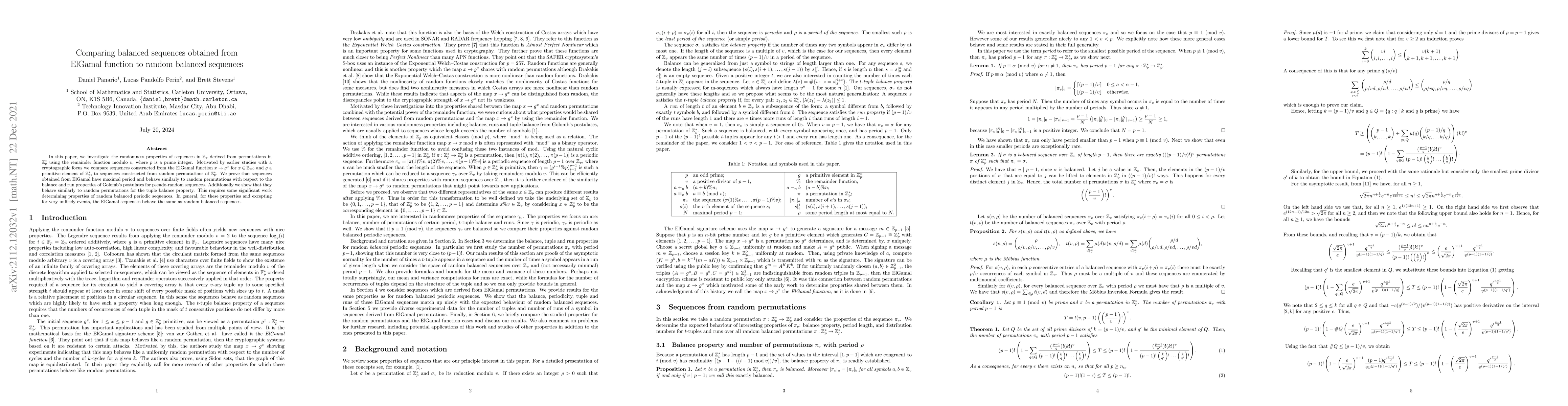 ElGamal sequences are compared to random balanced sequences in terms of period, balance, run properties, and tuple balance; findings show ElGamal sequences behave similarly to random sequences with maximal period.