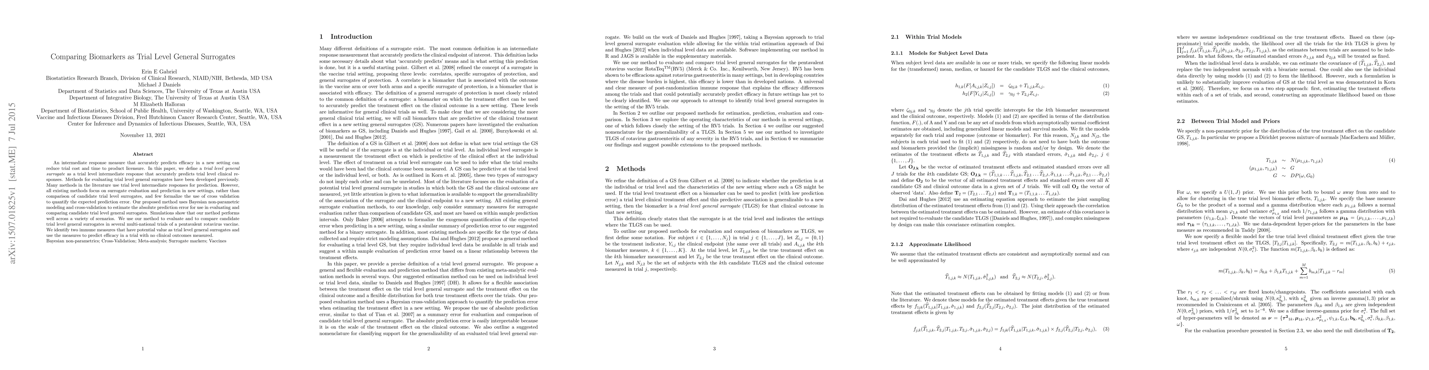 An intermediate response measure that accurately predicts efficacy in a new setting can reduce trial cost and time to product licensure. In this paper, we define a trial level general surrogate as a trial level intermediate response that accurately predicts trial level clinical responses. Methods for evaluating trial level general surrogates have been developed previously. Many methods in the literature use trial level intermediate responses for prediction. However, all existing methods focus on surrogate evaluation and prediction in new settings, rather than comparison of candidate trial level surrogates, and few formalize the use of cross validation to quantify the expected prediction error. Our proposed method uses Bayesian non-parametric modeling and cross-validation to estimate the absolute prediction error for use in evaluating and comparing candidate trial level general surrogates. Simulations show that our method performs well across a variety of scenarios. We use our method to evaluate and to compare candidate trial level general surrogates in several multi-national trials of a pentavalent rotavirus vaccine. We identify two immune measures that have potential value as trial level general surrogates and use the measures to predict efficacy in a trial with no clinical outcomes measured.