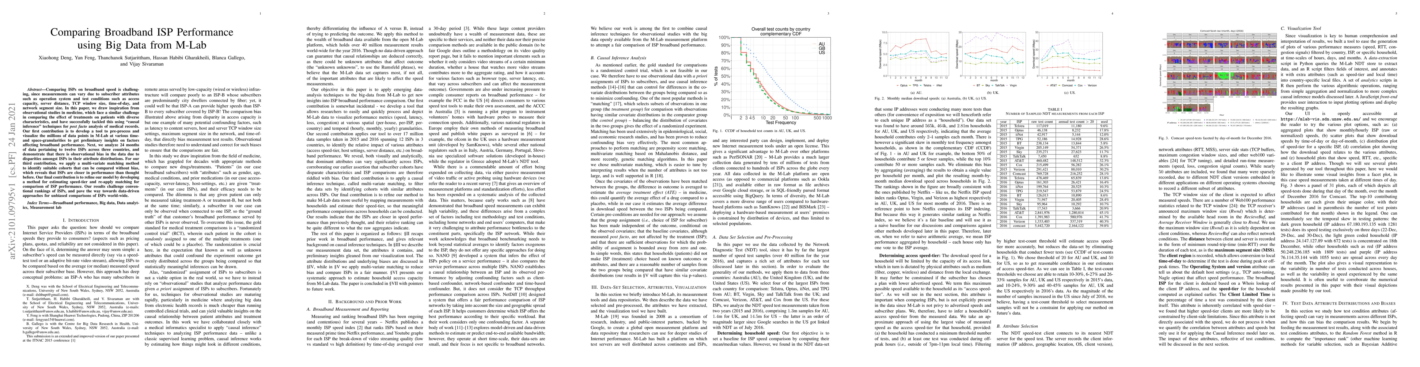 Comparing ISPs on broadband speed is challenging, since measurements can vary due to subscriber attributes such as operation system and test conditions such as access capacity, server distance, TCP window size, time-of-day, and network segment size. In this paper, we draw inspiration from observational studies in medicine, which face a similar challenge in comparing the effect of treatments on patients with diverse characteristics, and have successfully tackled this using "causal inference" techniques for {\em post facto} analysis of medical records. Our first contribution is to develop a tool to pre-process and visualize the millions of data points in M-Lab at various time- and space-granularities to get preliminary insights on factors affecting broadband performance. Next, we analyze 24 months of data pertaining to twelve ISPs across three countries, and demonstrate that there is observational bias in the data due to disparities amongst ISPs in their attribute distributions. For our third contribution, we apply a multi-variate matching method to identify suitable cohorts that can be compared without bias, which reveals that ISPs are closer in performance than thought before. Our final contribution is to refine our model by developing a method for estimating speed-tier and re-apply matching for comparison of ISP performance. Our results challenge conventional rankings of ISPs, and pave the way towards data-driven approaches for unbiased comparisons of ISPs world-wide.