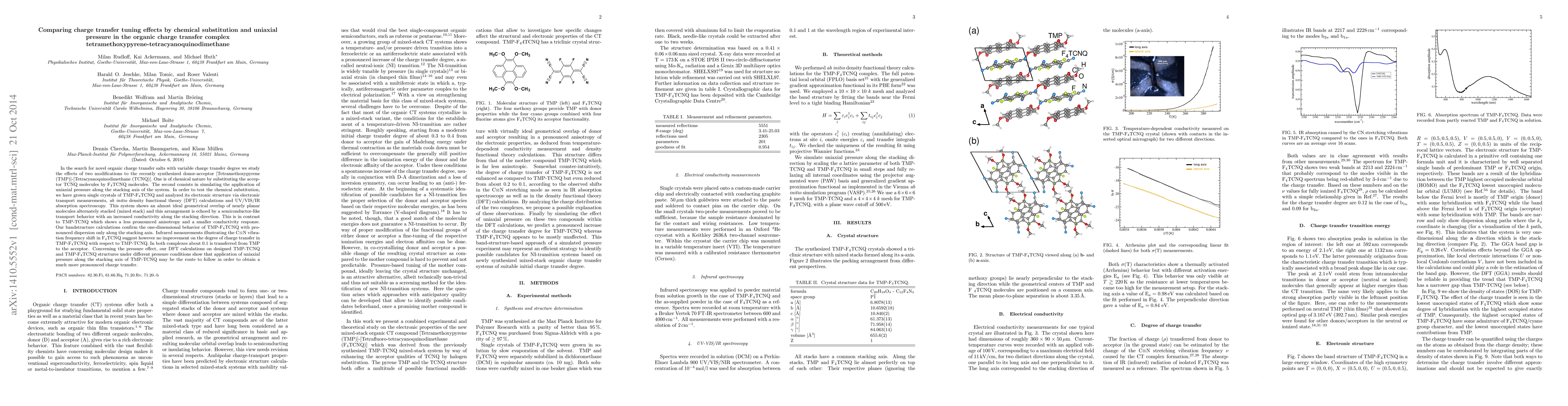This study investigates the charge transfer tuning in the organic charge transfer complex TMP-TCNQ by chemical substitution with F4TCNQ and uniaxial pressure. The TMP-F4TCNQ complex exhibits increased conductivity and one-dimensional behavior, but no significant improvement in charge transfer degree compared to TMP-TCNQ. Uniaxial pressure applied to TMP-TCNQ shows potential for enhancing charge transfer.