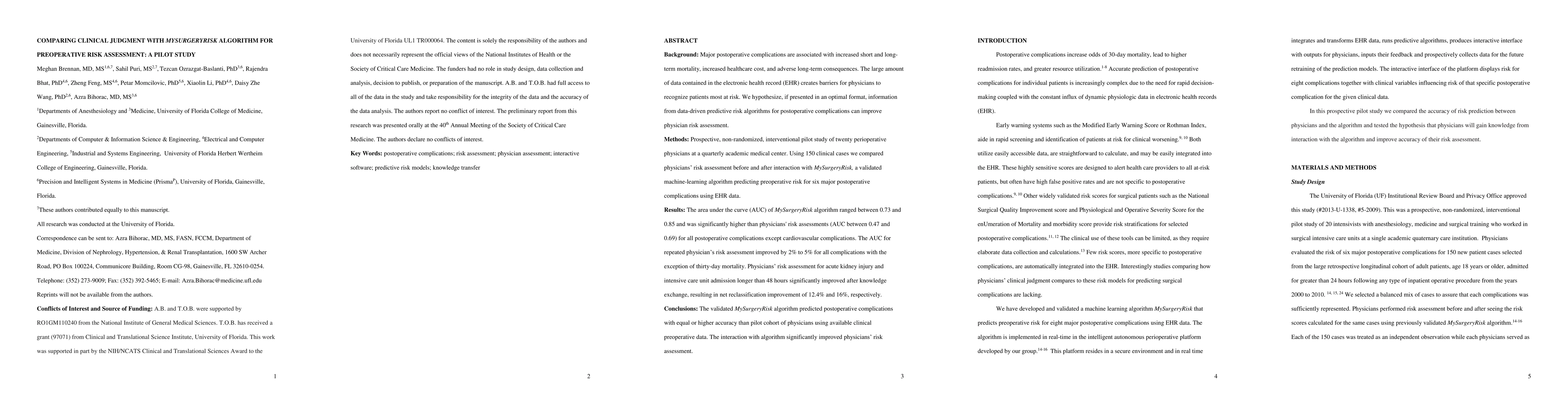 This pilot study compared clinical judgment with the MySurgeryRisk algorithm for preoperative risk assessment, finding that the algorithm significantly outperformed physicians' initial risk assessments. Interaction with the algorithm improved physicians' risk assessment accuracy, particularly for acute kidney injury and ICU admissions.