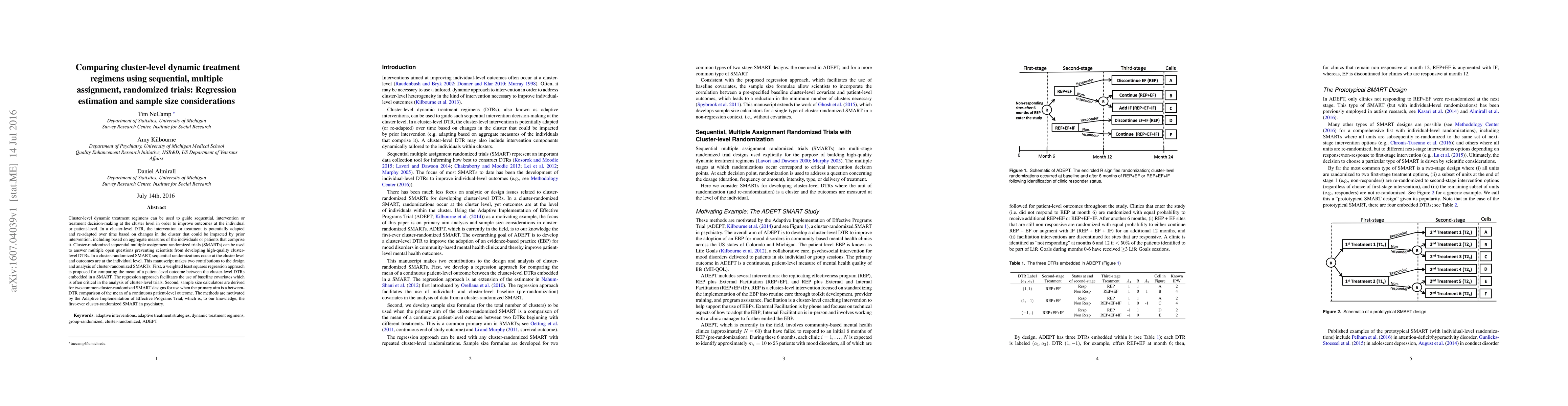 Cluster-level dynamic treatment regimens can be used to guide sequential, intervention or treatment decision-making at the cluster level in order to improve outcomes at the individual or patient-level. In a cluster-level DTR, the intervention or treatment is potentially adapted and re-adapted over time based on changes in the cluster that could be impacted by prior intervention, including based on aggregate measures of the individuals or patients that comprise it. Cluster-randomized sequential multiple assignment randomized trials (SMARTs) can be used to answer multiple open questions preventing scientists from developing high-quality cluster-level DTRs. In a cluster-randomized SMART, sequential randomizations occur at the cluster level and outcomes are at the individual level. This manuscript makes two contributions to the design and analysis of cluster-randomized SMARTs: First, a weighted least squares regression approach is proposed for comparing the mean of a patient-level outcome between the cluster-level DTRs embedded in a SMART. The regression approach facilitates the use of baseline covariates which is often critical in the analysis of cluster-level trials. Second, sample size calculators are derived for two common cluster-randomized SMART designs for use when the primary aim is a between-DTR comparison of the mean of a continuous patient-level outcome. The methods are motivated by the Adaptive Implementation of Effective Programs Trial, which is, to our knowledge, the first-ever cluster-randomized SMART in psychiatry.