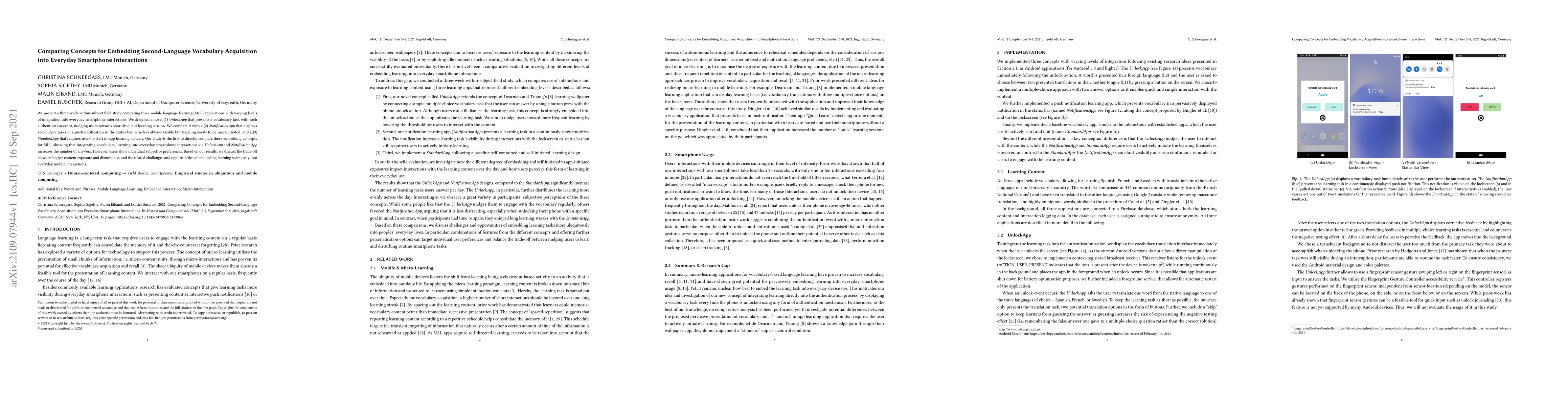 We present a three-week within-subject field study comparing three mobile language learning (MLL) applications with varying levels of integration into everyday smartphone interactions: We designed a novel (1) UnlockApp that presents a vocabulary task with each authentication event, nudging users towards short frequent learning sessions. We compare it with a (2) NotificationApp that displays vocabulary tasks in a push notification in the status bar, which is always visible but learning needs to be user-initiated, and a (3) StandardApp that requires users to start in-app learning actively. Our study is the first to directly compare these embedding concepts for MLL, showing that integrating vocabulary learning into everyday smartphone interactions via UnlockApp and NotificationApp increases the number of answers. However, users show individual subjective preferences. Based on our results, we discuss the trade-off between higher content exposure and disturbance, and the related challenges and opportunities of embedding learning seamlessly into everyday mobile interactions.