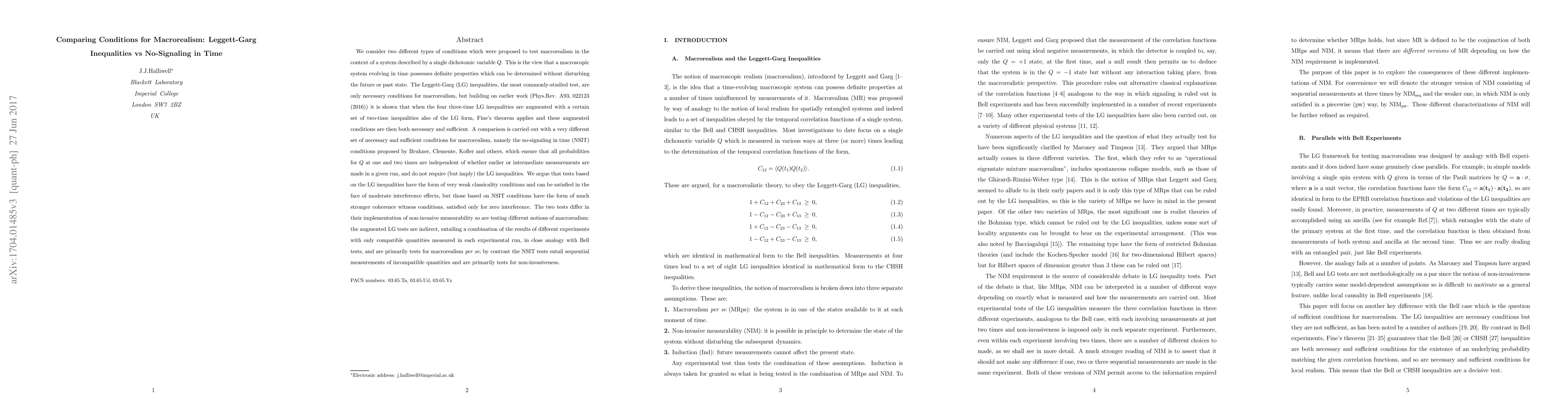 This paper compares two sets of conditions for testing macrorealism: the augmented Leggett-Garg inequalities and the no-signaling in time (NSIT) conditions. The former, when extended, are both necessary and sufficient, while the latter are stronger coherence witnesses. The study argues that NSIT tests are more stringent and primarily test for non-invasiveness, unlike the indirect, Bell-analog LG tests.