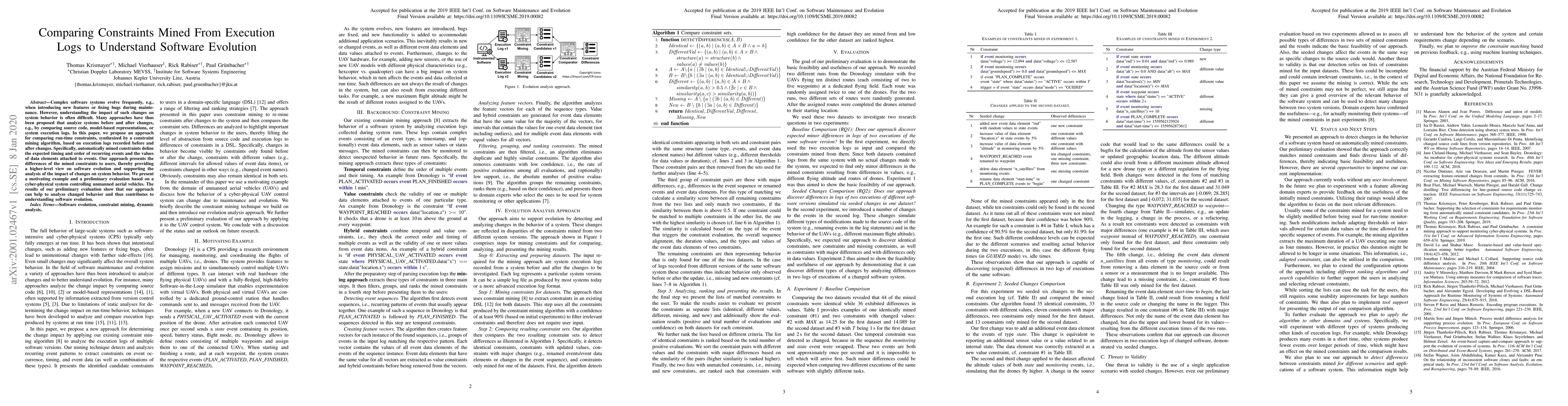Complex software systems evolve frequently, e.g., when introducing new features or fixing bugs during maintenance. However, understanding the impact of such changes on system behavior is often difficult. Many approaches have thus been proposed that analyze systems before and after changes, e.g., by comparing source code, model-based representations, or system execution logs. In this paper, we propose an approach for comparing run-time constraints, synthesized by a constraint mining algorithm, based on execution logs recorded before and after changes. Specifically, automatically mined constraints define the expected timing and order of recurring events and the values of data elements attached to events. Our approach presents the differences of the mined constraints to users, thereby providing a higher-level view on software evolution and supporting the analysis of the impact of changes on system behavior. We present a motivating example and a preliminary evaluation based on a cyber-physical system controlling unmanned aerial vehicles. The results of our preliminary evaluation show that our approach can help to analyze changed behavior and thus contributes to understanding software evolution.
