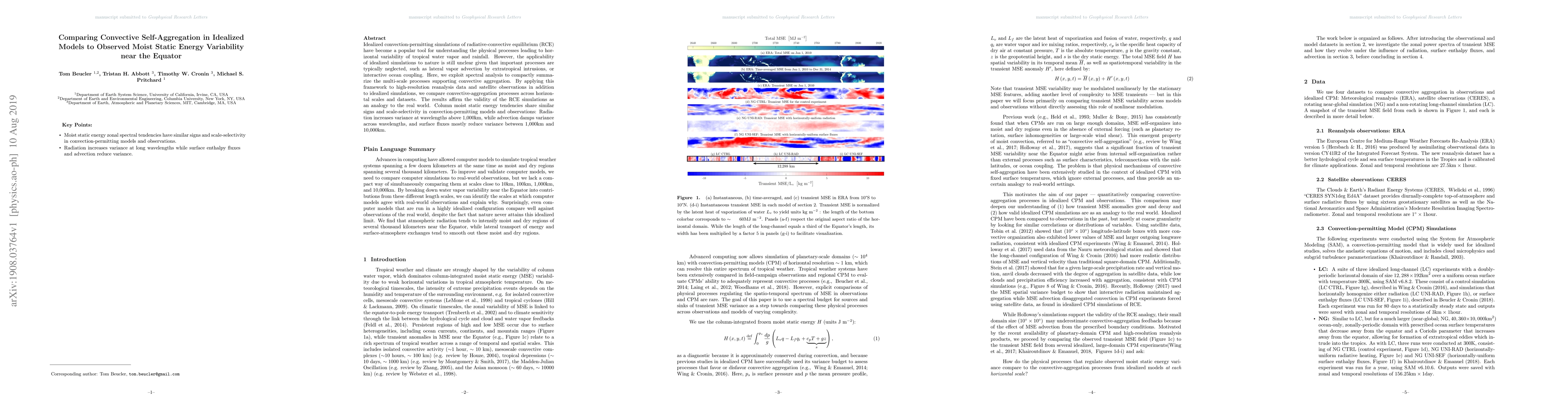 This paper compares idealized simulations of radiative-convective equilibrium to observed moist static energy variability near the equator, finding similar multi-scale processes in both. The study uses spectral analysis to show that radiation, advection, and surface fluxes affect variance in comparable ways across models and observations.