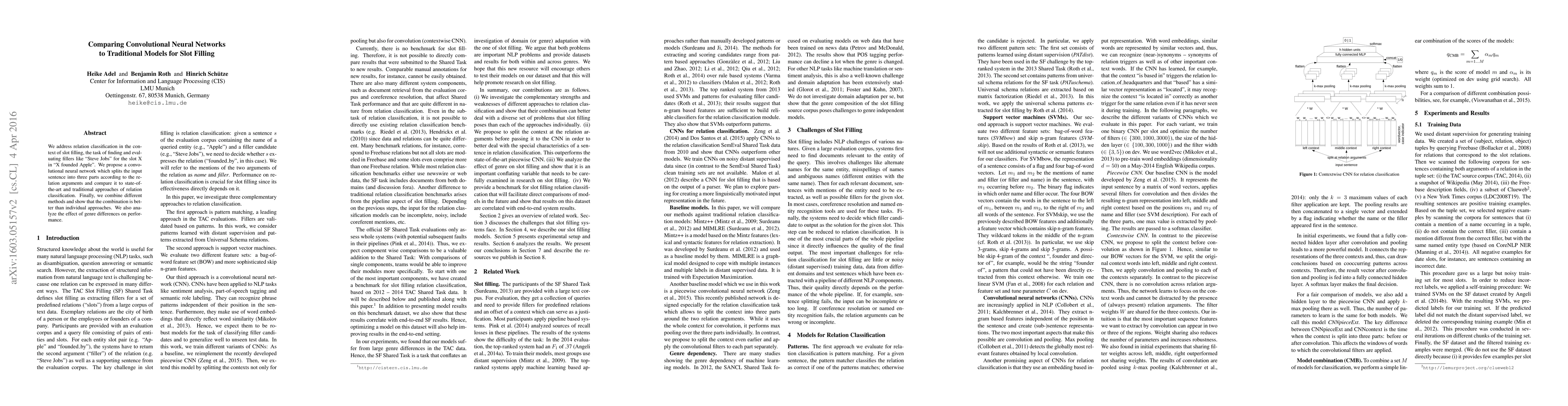 We address relation classification in the context of slot filling, the task of finding and evaluating fillers like "Steve Jobs" for the slot X in "X founded Apple". We propose a convolutional neural network which splits the input sentence into three parts according to the relation arguments and compare it to state-of-the-art and traditional approaches of relation classification. Finally, we combine different methods and show that the combination is better than individual approaches. We also analyze the effect of genre differences on performance.