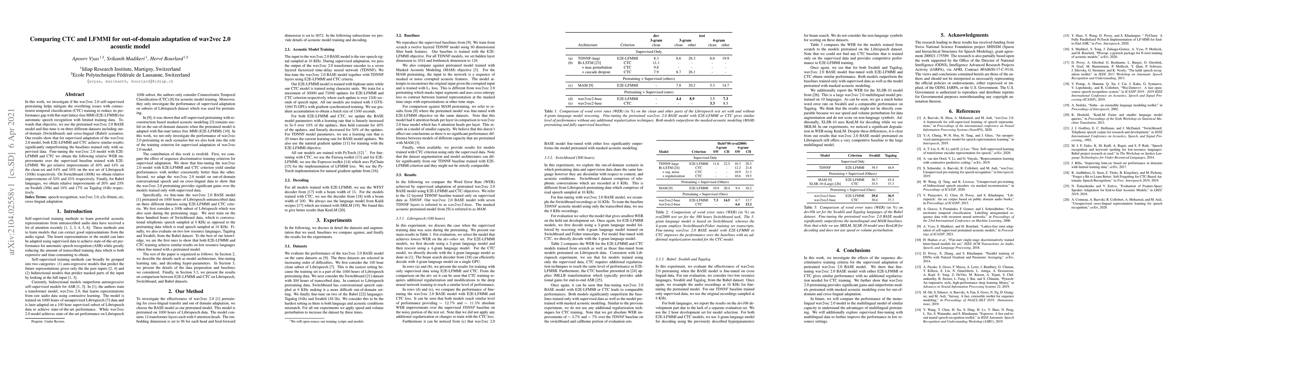 This research compares CTC and LFMMI for adapting wav2vec 2.0 acoustic models to out-of-domain data. Results show that both methods, when fine-tuning pretrained wav2vec 2.0, significantly outperform baselines on various datasets like Librispeech, Switchboard, and Babel languages. WER improvements range from 17% to 64% across test sets.