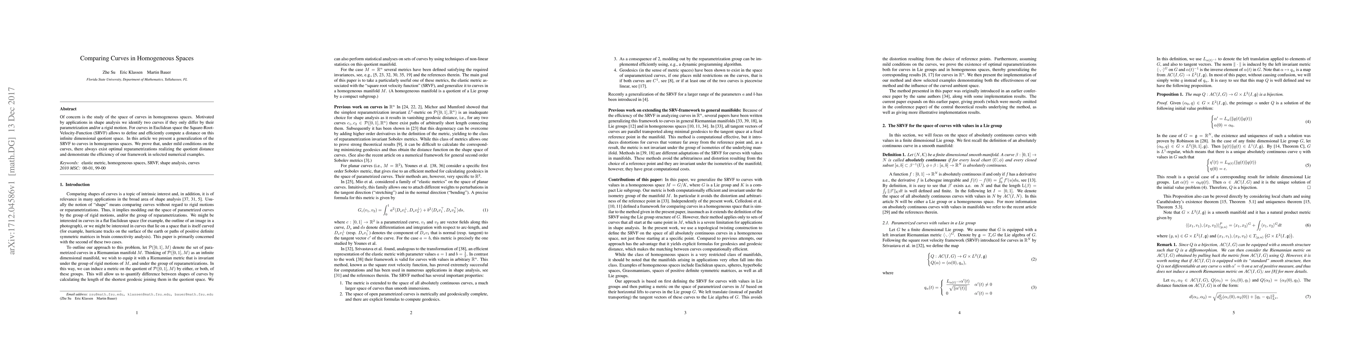 This paper generalizes the Square-Root-Velocity-Function (SRVF) to compute distances between curves in homogeneous spaces, addressing shape analysis applications. It proves the existence of optimal reparametrizations for realizing the quotient distance and demonstrates its efficiency through numerical examples.