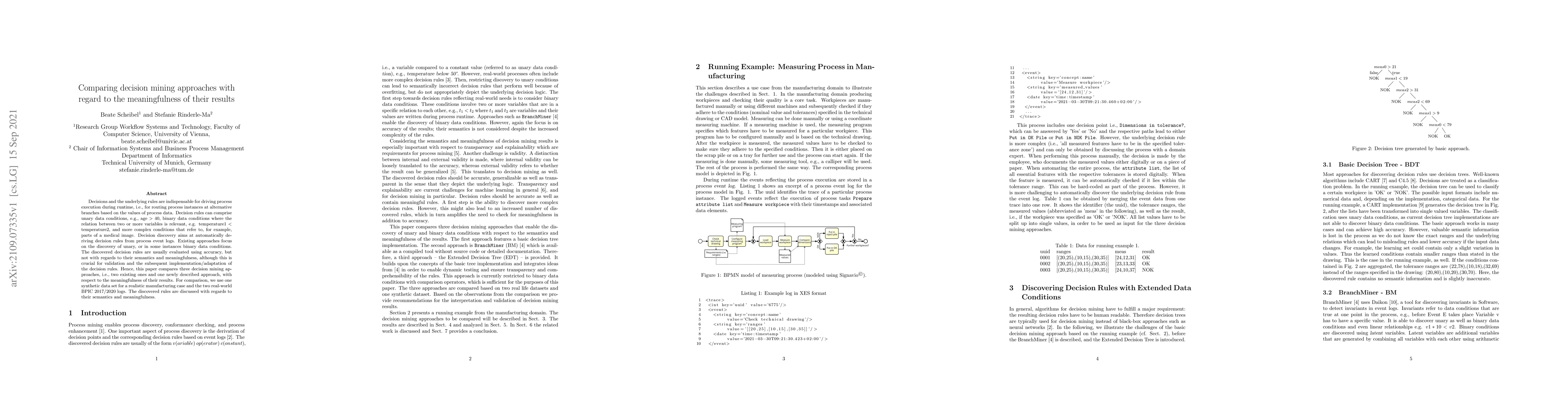Decisions and the underlying rules are indispensable for driving process execution during runtime, i.e., for routing process instances at alternative branches based on the values of process data. Decision rules can comprise unary data conditions, e.g., age > 40, binary data conditions where the relation between two or more variables is relevant, e.g. temperature1 < temperature2, and more complex conditions that refer to, for example, parts of a medical image. Decision discovery aims at automatically deriving decision rules from process event logs. Existing approaches focus on the discovery of unary, or in some instances binary data conditions. The discovered decision rules are usually evaluated using accuracy, but not with regards to their semantics and meaningfulness, although this is crucial for validation and the subsequent implementation/adaptation of the decision rules. Hence, this paper compares three decision mining approaches, i.e., two existing ones and one newly described approach, with respect to the meaningfulness of their results. For comparison, we use one synthetic data set for a realistic manufacturing case and the two real-world BPIC 2017/2020 logs. The discovered rules are discussed with regards to their semantics and meaningfulness.