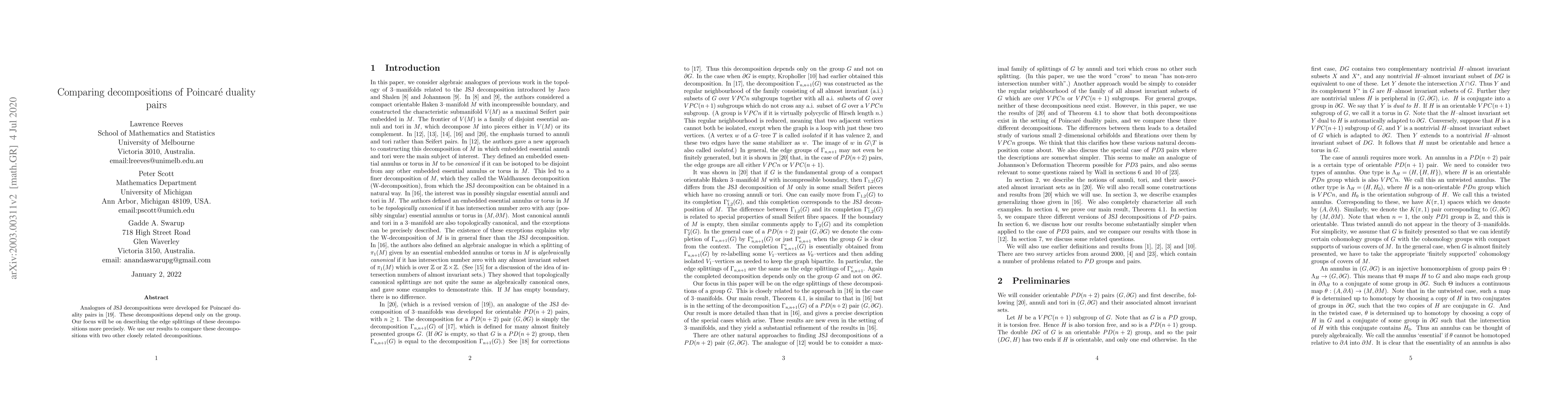 This paper develops analogues of JSJ decompositions for Poincaré duality pairs, emphasizing precise descriptions of edge splittings and comparing these decompositions with two other related ones. The focus is on how these decompositions depend solely on the underlying group.