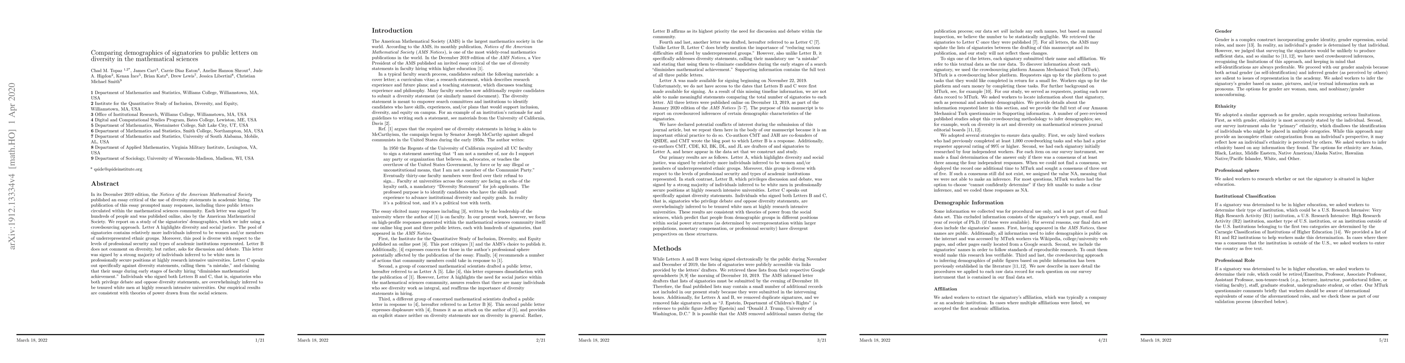 In its December 2019 edition, the \textit{Notices of the American Mathematical Society} published an essay critical of the use of diversity statements in academic hiring. The publication of this essay prompted many responses, including three public letters circulated within the mathematical sciences community. Each letter was signed by hundreds of people and was published online, also by the American Mathematical Society. We report on a study of the signatories' demographics, which we infer using a crowdsourcing approach. Letter A highlights diversity and social justice. The pool of signatories contains relatively more individuals inferred to be women and/or members of underrepresented ethnic groups. Moreover, this pool is diverse with respect to the levels of professional security and types of academic institutions represented. Letter B does not comment on diversity, but rather, asks for discussion and debate. This letter was signed by a strong majority of individuals inferred to be white men in professionally secure positions at highly research intensive universities. Letter C speaks out specifically against diversity statements, calling them "a mistake," and claiming that their usage during early stages of faculty hiring "diminishes mathematical achievement." Individuals who signed both Letters B and C, that is, signatories who both privilege debate and oppose diversity statements, are overwhelmingly inferred to be tenured white men at highly research intensive universities. Our empirical results are consistent with theories of power drawn from the social sciences.