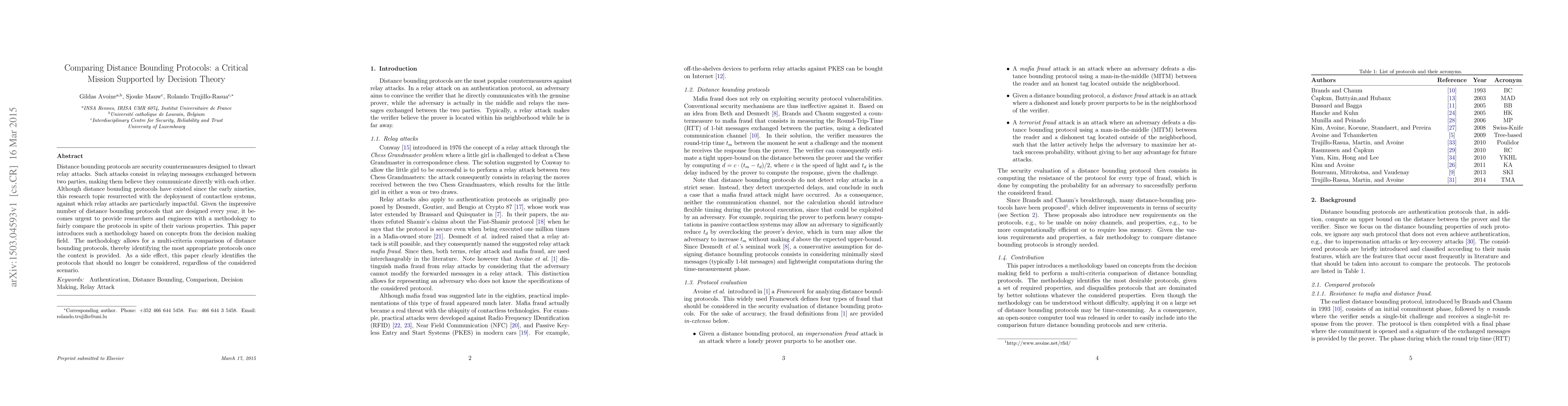 This paper proposes a decision theory-based methodology to compare various distance bounding protocols, which are security measures against relay attacks in contactless systems. The methodology enables a multi-criteria assessment, aiding researchers in selecting the most suitable protocols for specific contexts while identifying outdated ones.