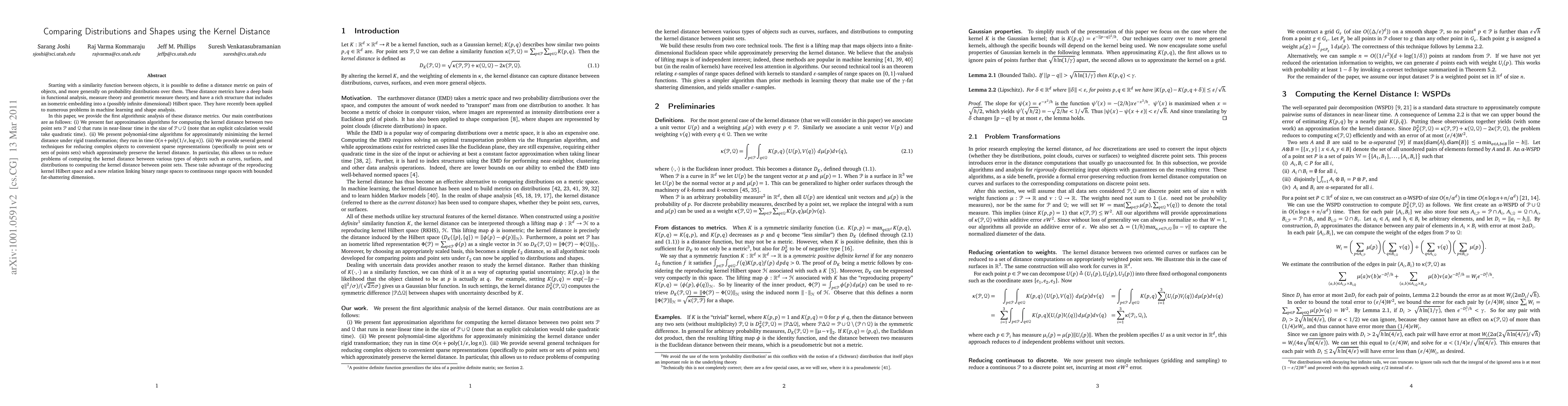 This paper introduces fast algorithms for computing and minimizing the kernel distance between point sets, enabling efficient shape analysis. It also provides methods to reduce complex objects to sparse representations while preserving the kernel distance, facilitating the analysis of curves, surfaces, and distributions.