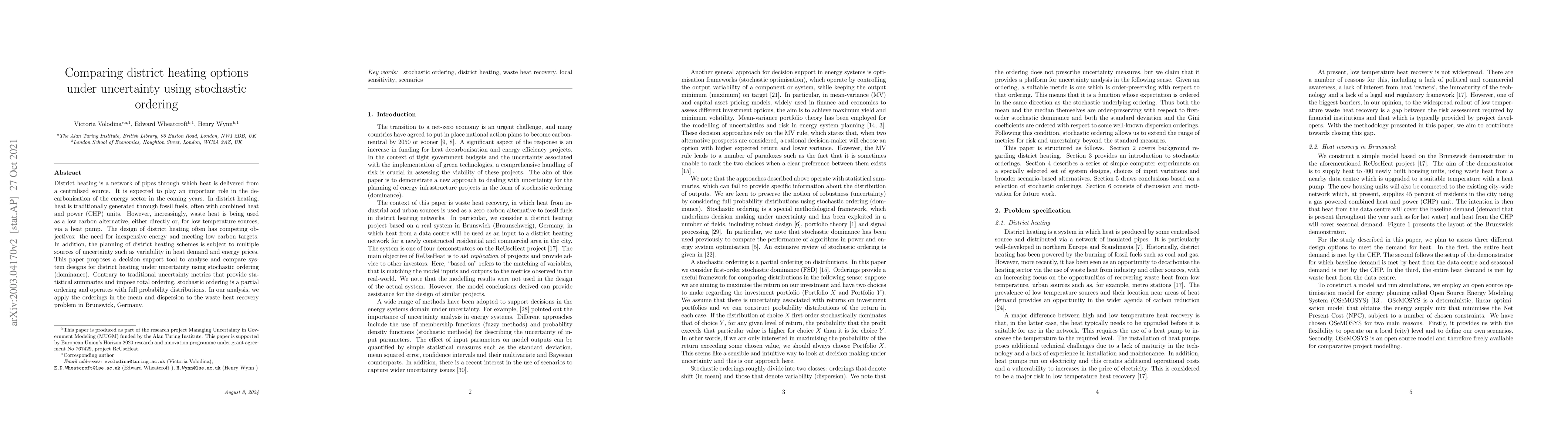 District heating is a network of pipes through which heat is delivered from a centralised source. It is expected to play an important role in the decarbonisation of the energy sector in the coming years. In district heating, heat is traditionally generated through fossil fuels, often with combined heat and power (CHP) units. However, increasingly, waste heat is being used as a low carbon alternative, either directly or, for low temperature sources, via a heat pump. The design of district heating often has competing objectives: the need for inexpensive energy and meeting low carbon targets. In addition, the planning of district heating schemes is subject to multiple sources of uncertainty such as variability in heat demand and energy prices. This paper proposes a decision support tool to analyse and compare system designs for district heating under uncertainty using stochastic ordering (dominance). Contrary to traditional uncertainty metrics that provide statistical summaries and impose total ordering, stochastic ordering is a partial ordering and operates with full probability distributions. In our analysis, we apply the orderings in the mean and dispersion to the waste heat recovery problem in Brunswick, Germany.