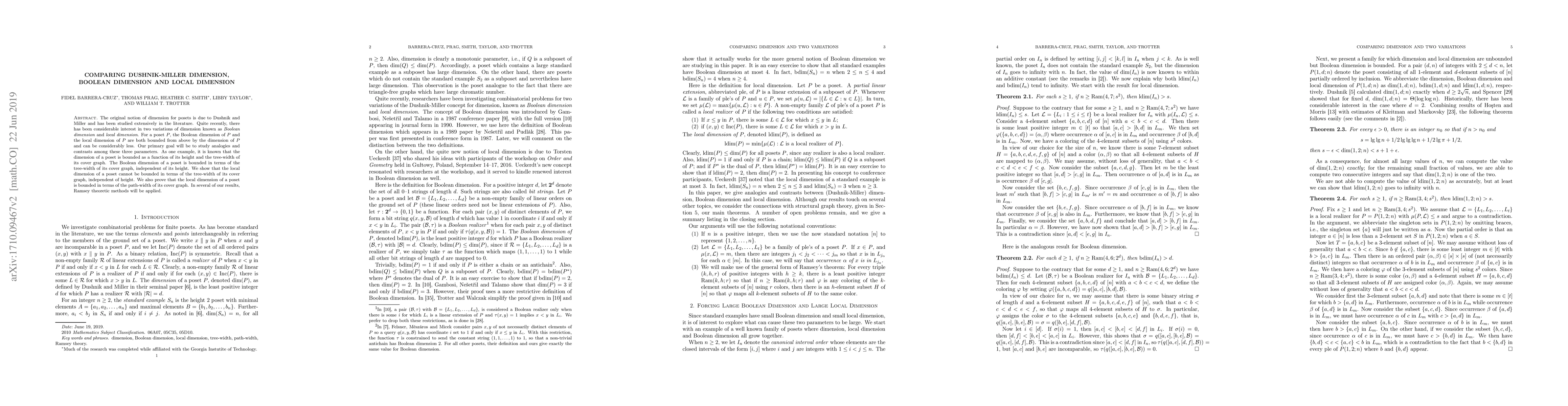 The original notion of dimension for posets is due to Dushnik and Miller and has been studied extensively in the literature. Quite recently, there has been considerable interest in two variations of dimension known as Boolean dimension and local dimension. For a poset $P$, the Boolean dimension of $P$ and the local dimension of $P$ are both bounded from above by the dimension of $P$ and can be considerably less. Our primary goal will be to study analogies and contrasts among these three parameters. As one example, it is known that the dimension of a poset is bounded as a function of its height and the tree-width of its cover graph. The Boolean dimension of a poset is bounded in terms of the tree-width of its cover graph, independent of its height. We show that the local dimension of a poset cannot be bounded in terms of the tree-width of its cover graph, independent of height. We also prove that the local dimension of a poset is bounded in terms of the path-width of its cover graph. In several of our results, Ramsey theoretic methods will be applied.