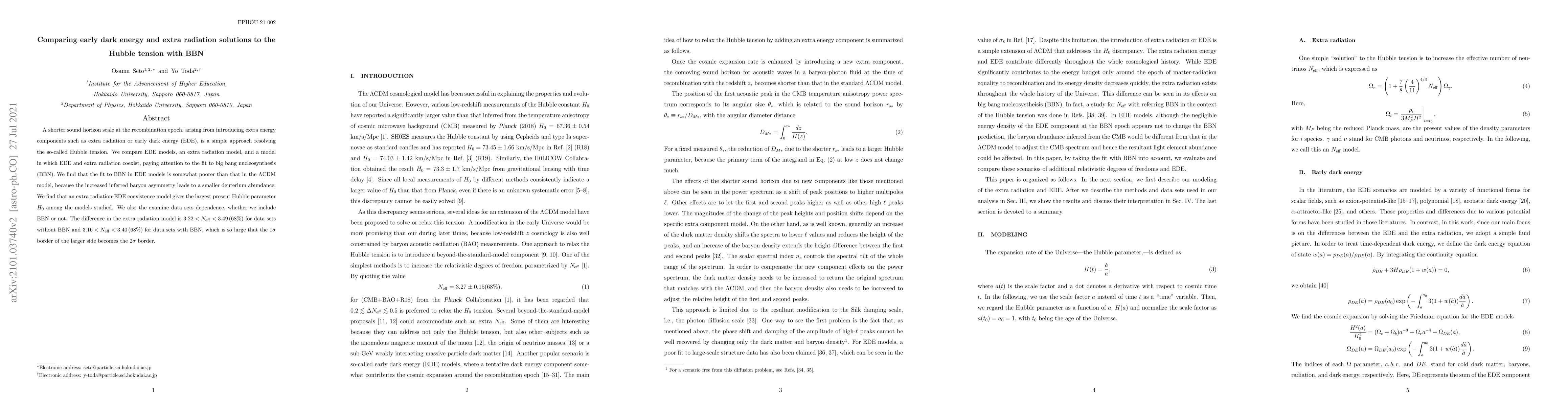 The shorten sound horizon scale at the recombination epoch by introducing extra energy components such as the extra radiation or early dark energy (EDE) is a simple approach to so-called the Hubble tension. We compare EDE models, an extra radiation model and an EDE and extra radiation co-existing model with paying attention to the fit to big bang nucleosynthesis (BBN). We find that a fit to BBN in EDE models also is somewhat poorer than that in the $\Lambda$CDM model, because the increased inferred baryon asymmetry leads to smaller deuterium abundance. We find that an extra radiation-EDE co-existing model indicates the largest present Hubble parameter $H_0$ between models studied. We also the examine data sets dependence, whether we include BBN or not. The difference in an extra radiation model is $3.22 < N_\mathrm{eff} < 3.49 \,(68 \%)$ for data sets without BBN and $3.16 < N_\mathrm{eff} < 3.40 \,(68 \%)$ for data sets with BBN, and is so large that the $1\sigma$ border of the larger side becomes the $2\sigma$ border.