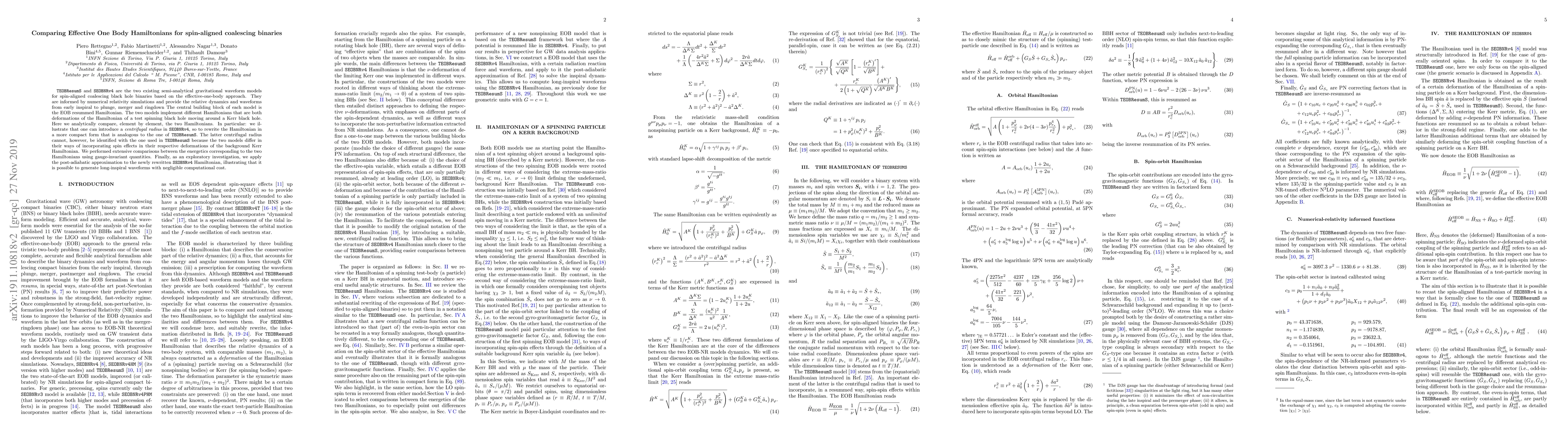 This paper analytically compares the effective-one-body Hamiltonians of TEOBResumS and SEOBNRv4 models for spin-aligned coalescing black hole binaries, revealing differences in their respective spin-incorporation methods. The study also demonstrates the potential of the SEOBNRv4 Hamiltonian to generate long-inspiral waveforms with reduced computational effort using the post-adiabatic approximation.