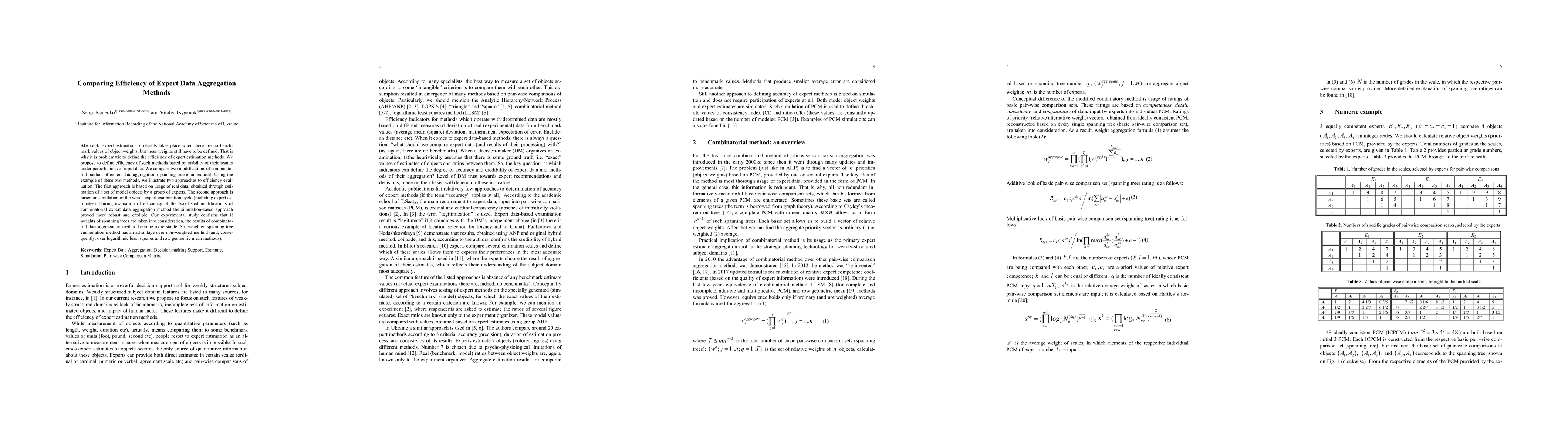 Researchers compared two expert data aggregation methods for estimating object weights without benchmark values. They found that a weighted spanning tree enumeration method outperformed non-weighted methods in terms of stability and credibility.