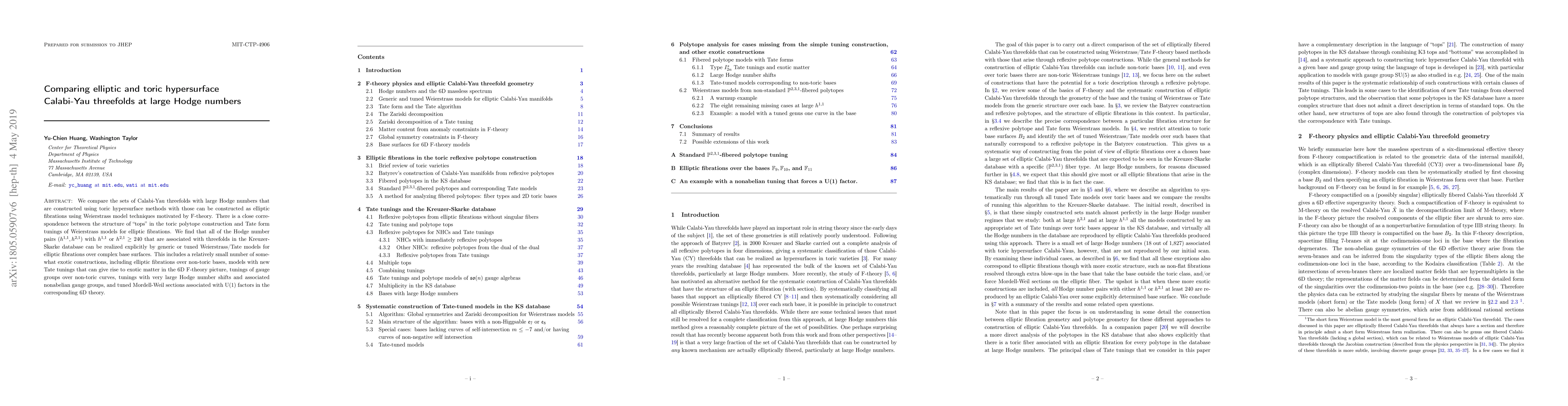 We compare the sets of Calabi-Yau threefolds with large Hodge numbers that are constructed using toric hypersurface methods with those can be constructed as elliptic fibrations using Weierstrass model techniques motivated by F-theory. There is a close correspondence between the structure of "tops" in the toric polytope construction and Tate form tunings of Weierstrass models for elliptic fibrations. We find that all of the Hodge number pairs ($h^{1, 1},h^{2, 1}$) with $h^{1,1}$ or $h^{2, 1}\geq 240$ that are associated with threefolds in the Kreuzer-Skarke database can be realized explicitly by generic or tuned Weierstrass/Tate models for elliptic fibrations over complex base surfaces. This includes a relatively small number of somewhat exotic constructions, including elliptic fibrations over non-toric bases, models with new Tate tunings that can give rise to exotic matter in the 6D F-theory picture, tunings of gauge groups over non-toric curves, tunings with very large Hodge number shifts and associated nonabelian gauge groups, and tuned Mordell-Weil sections associated with U(1) factors in the corresponding 6D theory.