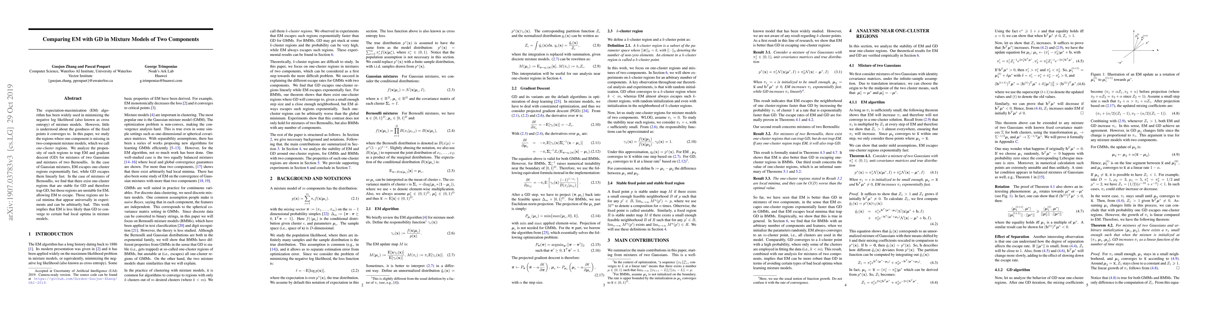 The expectation-maximization (EM) algorithm has been widely used in minimizing the negative log likelihood (also known as cross entropy) of mixture models. However, little is understood about the goodness of the fixed points it converges to. In this paper, we study the regions where one component is missing in two-component mixture models, which we call one-cluster regions. We analyze the propensity of such regions to trap EM and gradient descent (GD) for mixtures of two Gaussians and mixtures of two Bernoullis. In the case of Gaussian mixtures, EM escapes one-cluster regions exponentially fast, while GD escapes them linearly fast. In the case of mixtures of Bernoullis, we find that there exist one-cluster regions that are stable for GD and therefore trap GD, but those regions are unstable for EM, allowing EM to escape. Those regions are local minima that appear universally in experiments and can be arbitrarily bad. This work implies that EM is less likely than GD to converge to certain bad local optima in mixture models.
