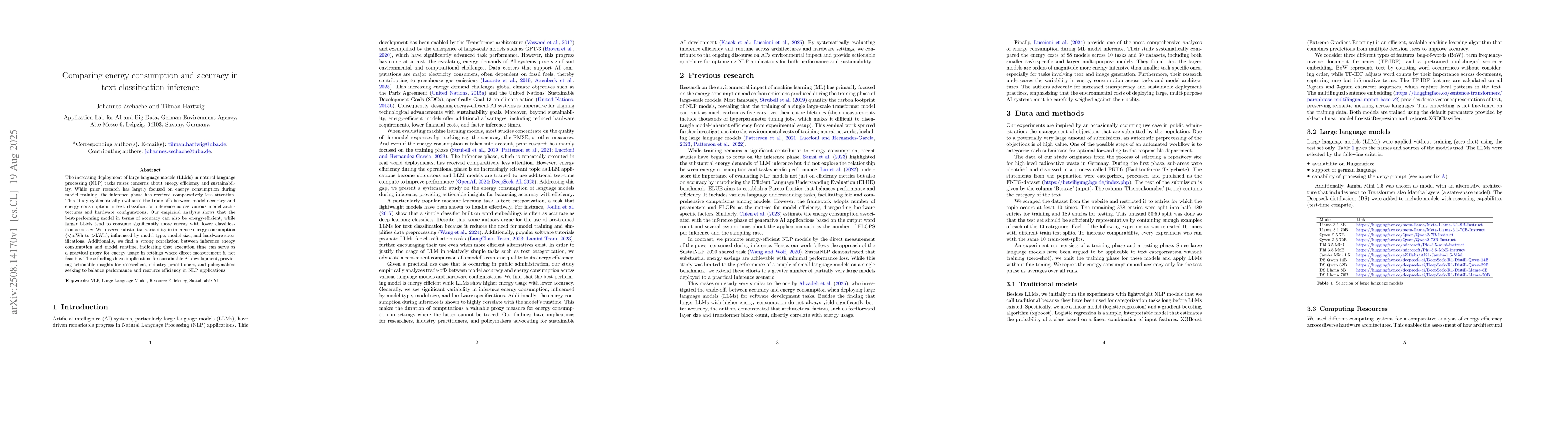 The increasing deployment of large language models (LLMs) in natural language processing (NLP) tasks raises concerns about energy efficiency and sustainability. While prior research has largely focused on energy consumption during model training, the inference phase has received comparatively less attention. This study systematically evaluates the trade-offs between model accuracy and energy consumption in text classification inference across various model architectures and hardware configurations. Our empirical analysis shows that the best-performing model in terms of accuracy can also be energy-efficient, while larger LLMs tend to consume significantly more energy with lower classification accuracy. We observe substantial variability in inference energy consumption ($<$mWh to $>$kWh), influenced by model type, model size, and hardware specifications. Additionally, we find a strong correlation between inference energy consumption and model runtime, indicating that execution time can serve as a practical proxy for energy usage in settings where direct measurement is not feasible. These findings have implications for sustainable AI development, providing actionable insights for researchers, industry practitioners, and policymakers seeking to balance performance and resource efficiency in NLP applications.